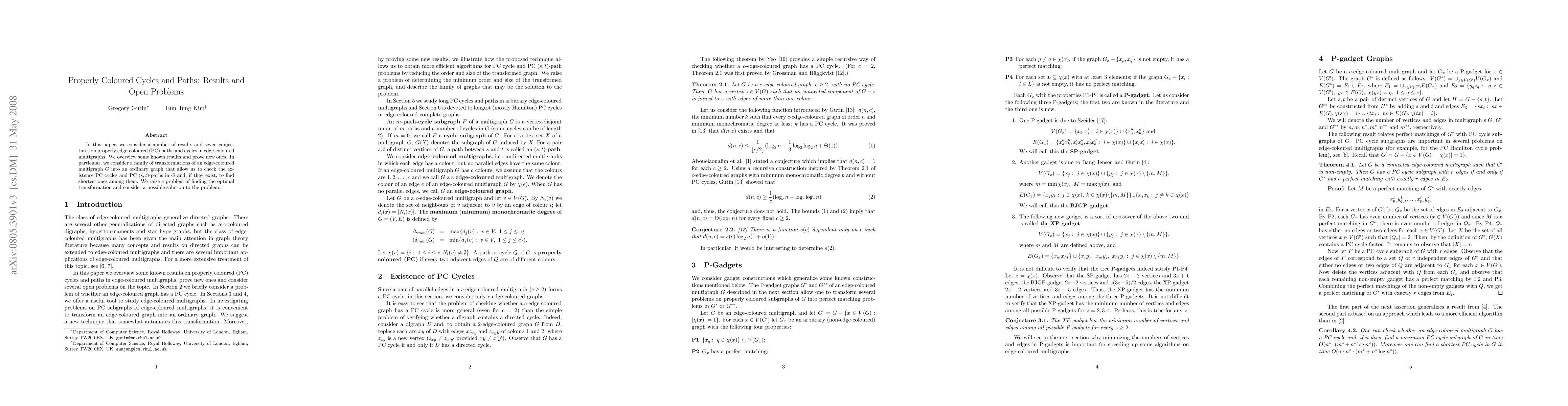 In this paper, we consider a number of results and seven conjectures on properly edge-coloured (PC) paths and cycles in edge-coloured multigraphs. We overview some known results and prove new ones. In particular, we consider a family of transformations of an edge-coloured multigraph $G$ into an ordinary graph that allow us to check the existence PC cycles and PC $(s,t)$-paths in $G$ and, if they exist, to find shortest ones among them. We raise a problem of finding the optimal transformation and consider a possible solution to the problem.