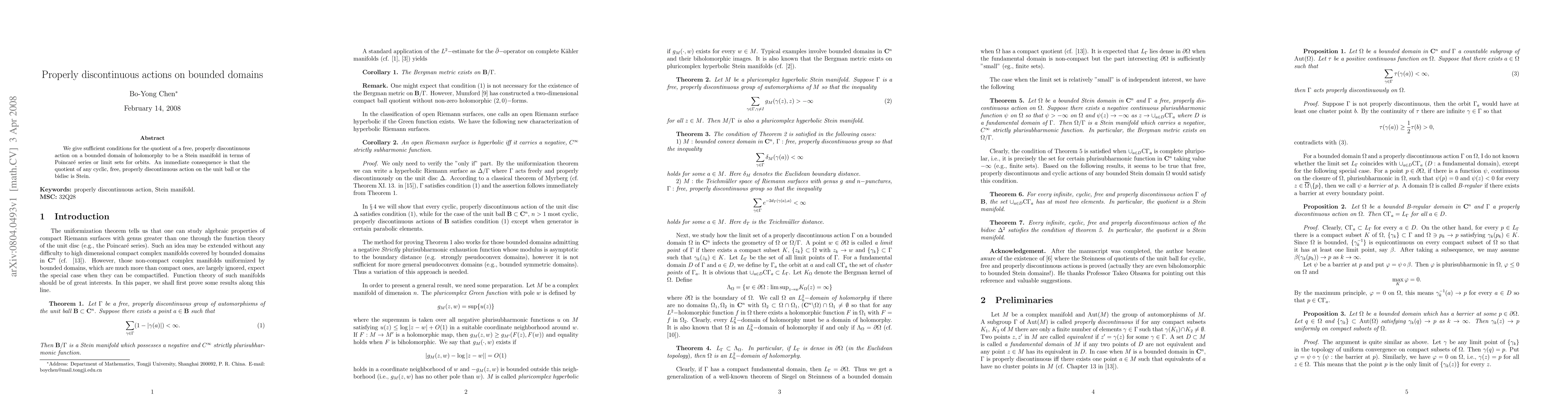 This paper provides conditions for the quotient of a free, properly discontinuous action on a bounded domain to be a Stein manifold, using Poincaré series or limit sets. It concludes that any cyclic, free, properly discontinuous action on the unit ball or the bidisc results in a Stein quotient.