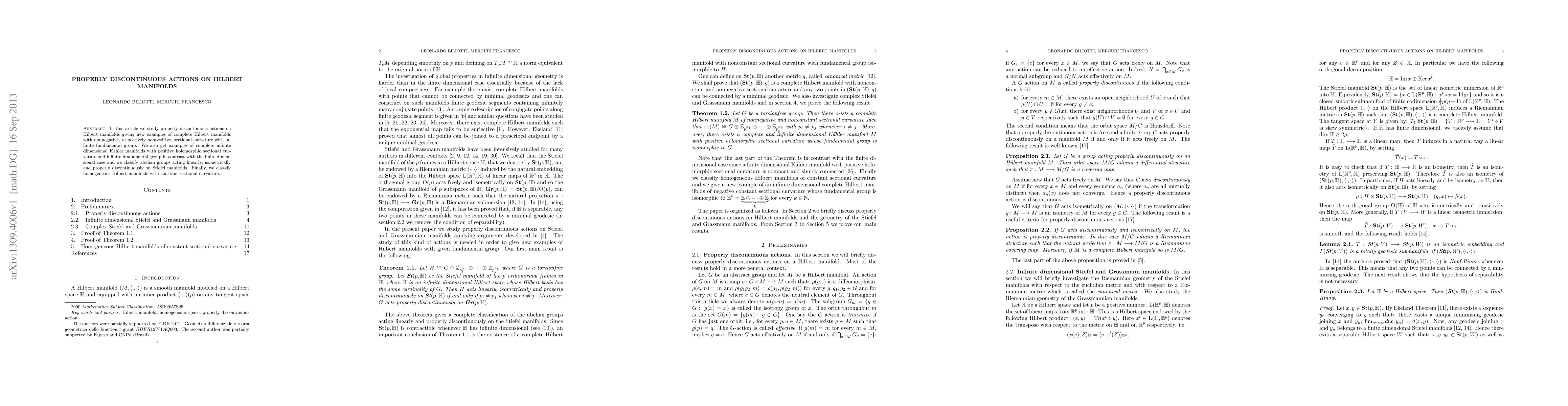 This paper investigates properly discontinuous actions on Hilbert manifolds, providing examples of complete manifolds with infinite fundamental groups and specific curvature properties, including nonnegative or nonpositive sectional curvature. It also classifies abelian groups acting on Stiefel manifolds and homogeneous Hilbert manifolds with constant sectional curvature.