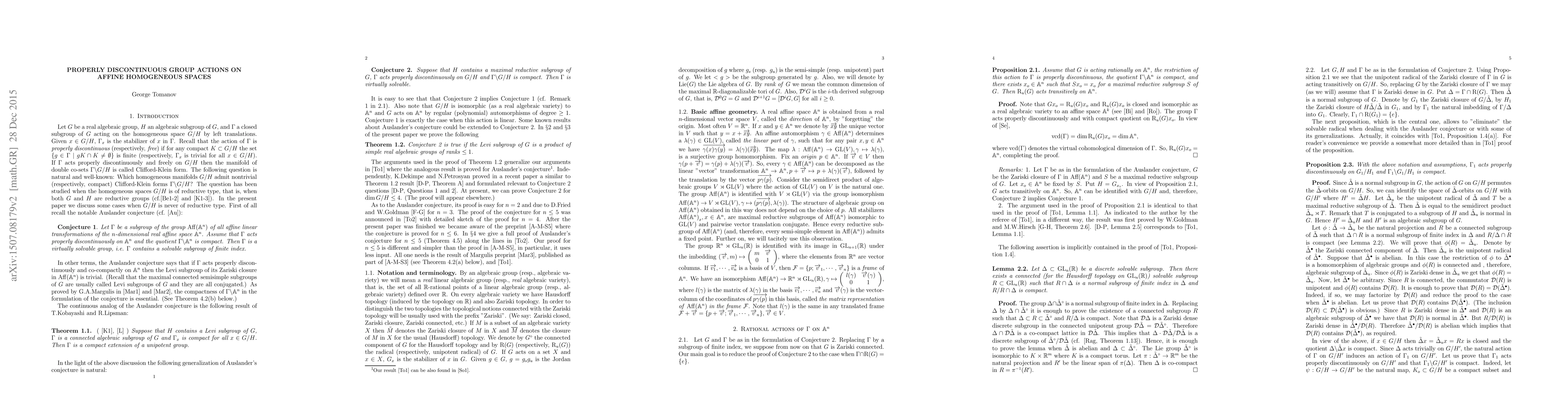 Researchers prove a generalization of the Auslander conjecture for specific group actions on affine homogeneous spaces, solving it for dimensions up to 5 and certain Levi factors.