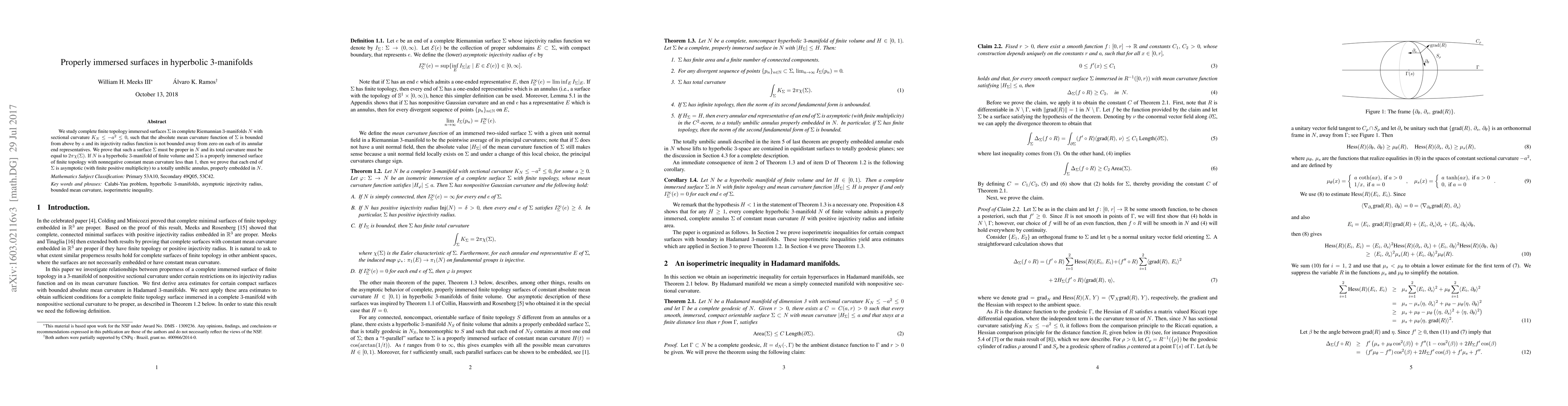 We study complete finite topology immersed surfaces $\Sigma$ in complete Riemannian $3$-manifolds $N$ with sectional curvature $K_N\leq -a^2\leq 0$, such that the absolute mean curvature function of $\Sigma$ is bounded from above by $a$ and its injectivity radius function is not bounded away from zero on each of its annular end representatives. We prove that such a surface $\Sigma$ must be proper in $N$ and its total curvature must be equal to $2\pi \chi(\Sigma)$. If $N$ is a hyperbolic $3$-manifold of finite volume and $\Sigma$ is a properly immersed surface of finite topology with nonnegative constant mean curvature less than 1, then we prove that each end of $\Sigma$ is asymptotic (with finite positive multiplicity) to a totally umbilic annulus, properly embedded in $N$.