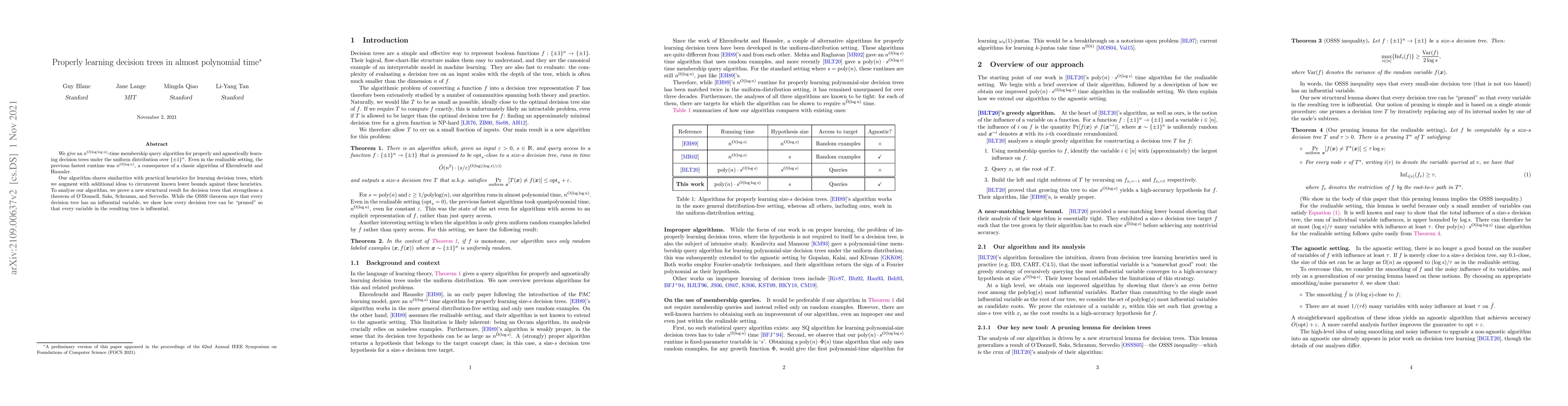 A new algorithm can learn decision trees in almost polynomial time, outperforming previous best times of $n^{O( ext{log log } n)}$, and builds on practical heuristics with a structural result that strengthens an existing theorem.
