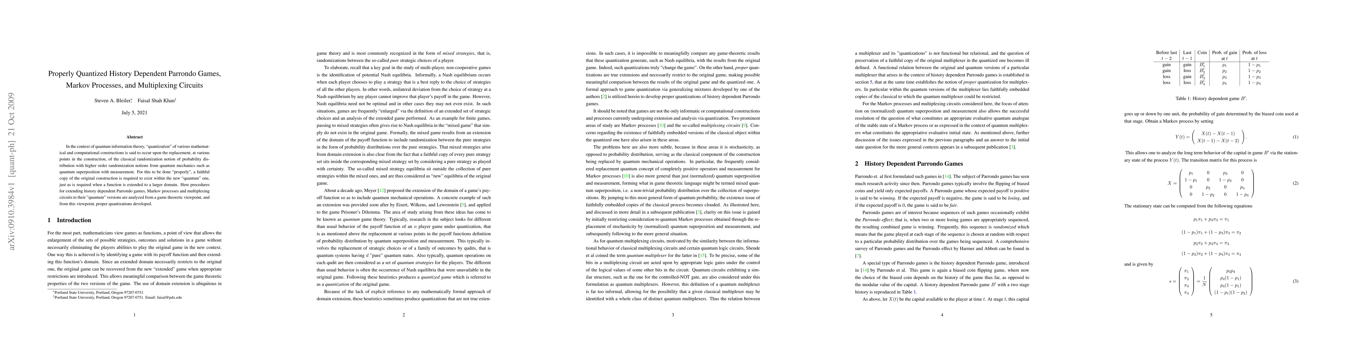 In the context of quantum information theory, "quantization" of various mathematical and computational constructions is said to occur upon the replacement, at various points in the construction, of the classical randomization notion of probability distribution with higher order randomization notions from quantum mechanics such as quantum superposition with measurement. For this to be done "properly", a faithful copy of the original construction is required to exist within the new "quantum" one, just as is required when a function is extended to a larger domain. Here procedures for extending history dependent Parrondo games, Markov processes and multiplexing circuits to their "quantum" versions are analyzed from a game theoretic viewpoint, and from this viewpoint, proper quantizations developed.
