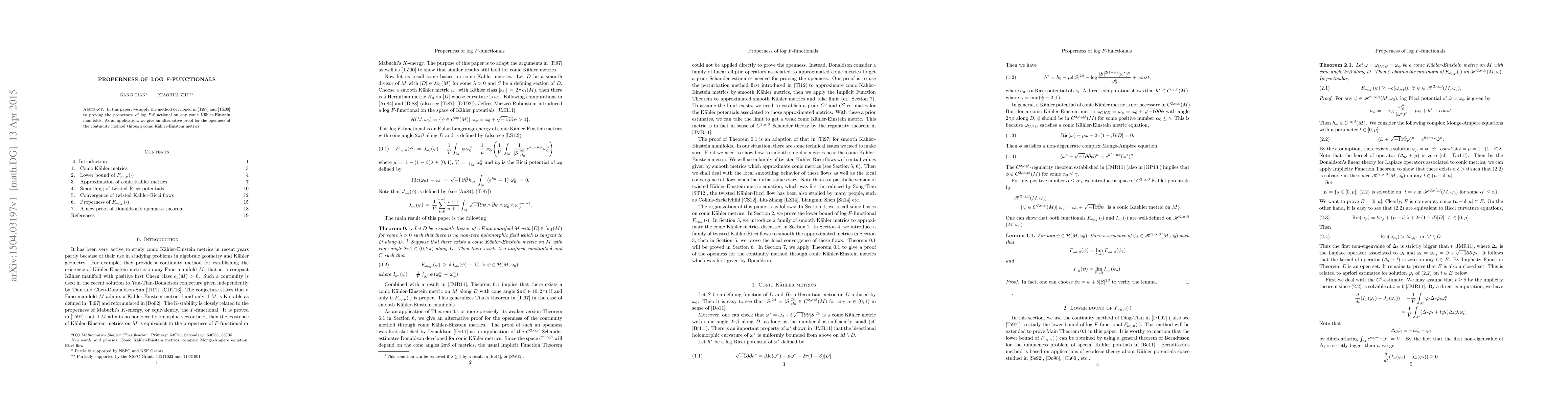 In this paper, we apply the method developed in [Ti97] and [TZ00] to proving the properness of log $F$-functional on any conic K\"ahler-Einstein manifolds. As an application, we give an alternative proof for the openness of the continuity method through conic K\"ahler-Einstein metrics.