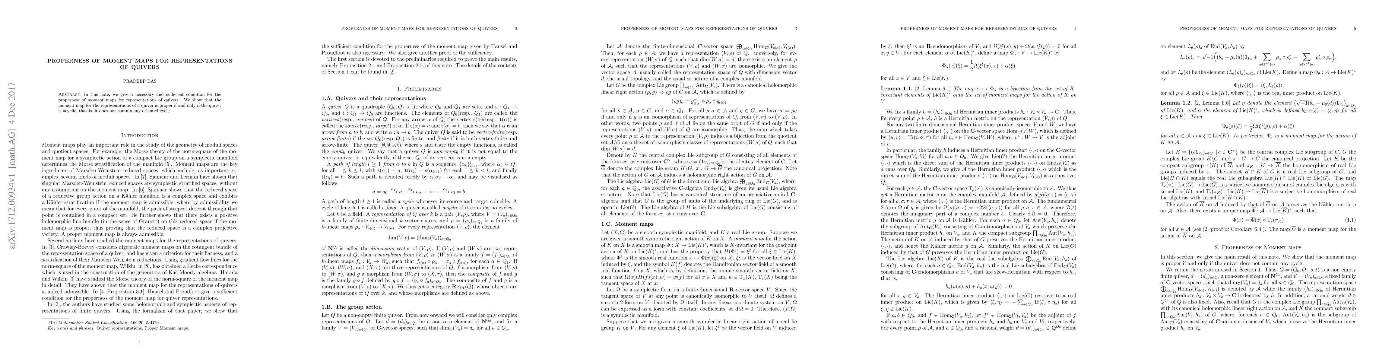 Summary: This paper establishes a necessary and sufficient condition for the properness of moment maps in quiver representations, proving that the moment map is proper if and only if the quiver is acyclic, meaning it lacks any oriented cycles.
