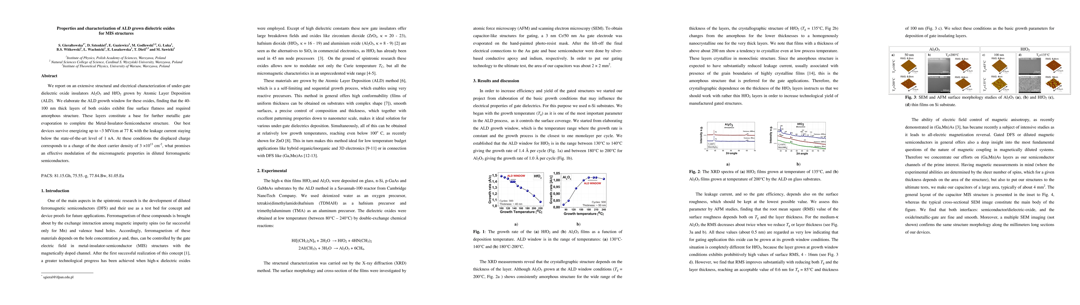 We report on an extensive structural and electrical characterization of under-gate dielectric oxide insulators Al2O3 and HfO2 grown by Atomic Layer Deposition (ALD). We elaborate the ALD growth window for these oxides, finding that the 40-100 nm thick layers of both oxides exhibit fine surface flatness and required amorphous structure. These layers constitute a base for further metallic gate evaporation to complete the Metal-Insulator-Semiconductor structure. Our best devices survive energizing up to ~3 MV/cm at 77 K with the leakage current staying below the state-of-the-art level of 1 nA. At these conditions the displaced charge corresponds to a change of the sheet carrier density of 3 \times 1013 cm-2, what promises an effective modulation of the micromagnetic properties in diluted ferromagnetic semiconductors.