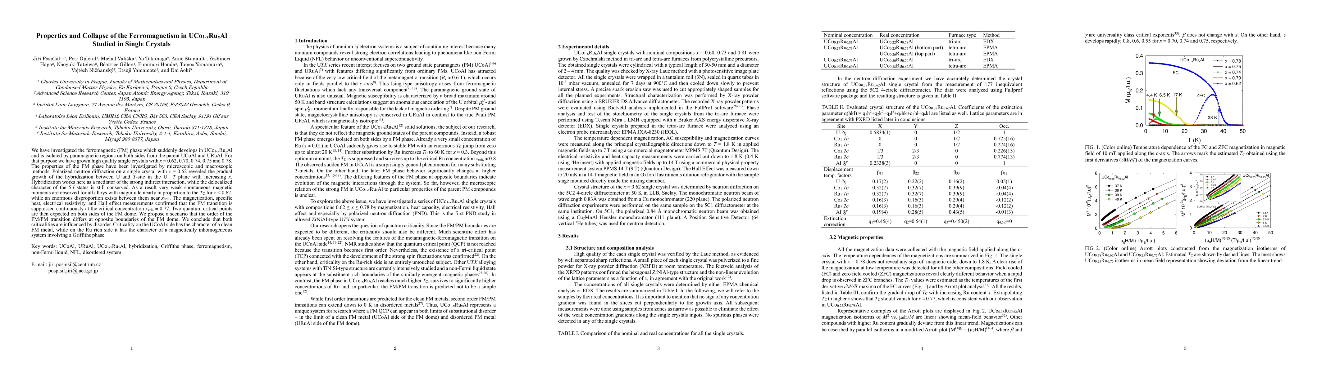 We have investigated the ferromagnetic (FM) phase which suddenly develops in UCo1-xRuxAl and is isolated by paramagnetic regions on both sides from the parent UCoAl and URuAl. For that purpose we have grown high quality single crystals with x = 0.62, 0.70, 0.74, 0.75 and 0.78. The properties of the FM phase have been investigated by microscopic and macroscopic methods. Polarized neutron diffraction on a single crystal with x = 0.62 revealed the gradual growth of the hybridization between U and T-site in the U - T plane with increasing x. Hybridization works here as a mediator of the strong indirect interaction, while the delocalized character of the 5 f states is still conserved. As a result very weak spontaneous magnetic moments are observed for all alloys with magnitude nearly in proportion to the TC for x < 0.62, while an enormous disproportion exists between them near xcrit.. The magnetization, specific heat, electrical resistivity, and Hall effect measurements confirmed that the FM transition is suppressed continuously at the critical concentration xcrit. = 0.77. Two quantum critical points are then expected on both sides of the FM dome. We propose a scenario that the order of the FM/PM transition differs at opposite boundaries of the FM dome. We conclude that both criticalities are influenced by disorder. Criticality on the UCoAl side has the character of a clean FM metal, while on the Ru rich side it has the character of a magnetically inhomogeneous system involving a Griffiths phase.