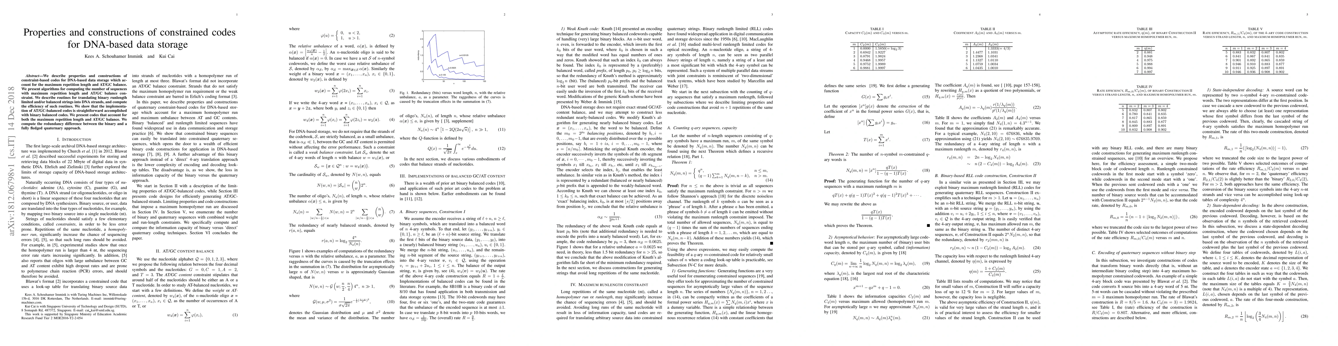 This paper discusses properties and construction methods for constraint-based DNA data storage codes, focusing on maximum repetition length and AT/GC balance. It presents algorithms for sequence computation under these constraints and routines for binary to DNA translation. The research also explores the efficiency of these routines and the simplicity of implementing AT/GC-balanced codes using binary balanced codes. Key findings include codes that address both maximum repetition length and AT/GC balance, alongside redundancy comparisons between binary and quaternary approaches.