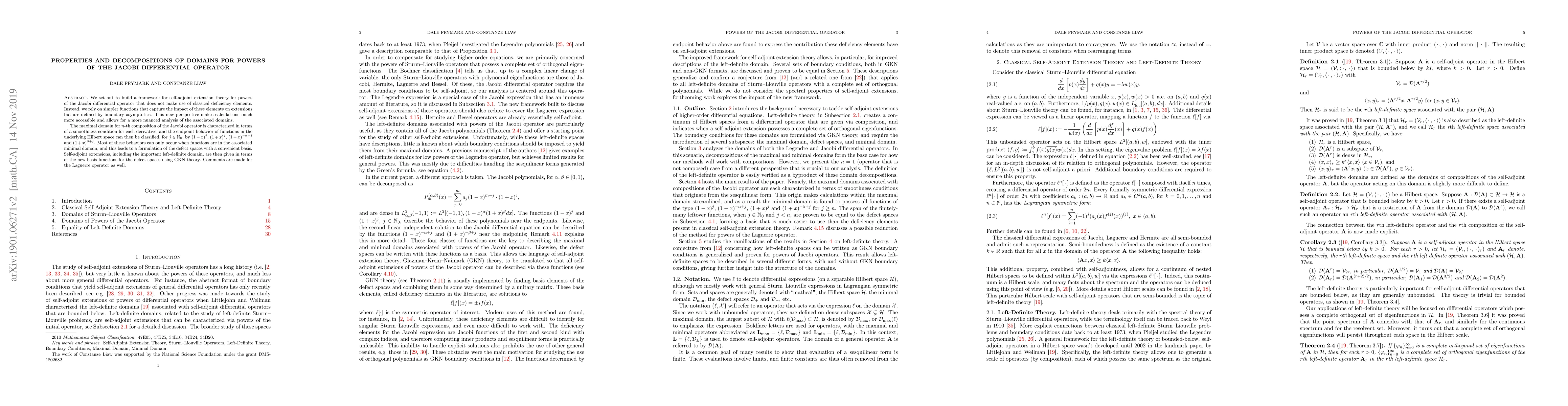 We set out to build a framework for self-adjoint extension theory for powers of the Jacobi differential operator that does not make use of classical deficiency elements. Instead, we rely on simpler functions that capture the impact of these elements on extensions but are defined by boundary asymptotics. This new perspective makes calculations much more accessible and allows for a more nuanced analysis of the associated domains. The maximal domain for $n$-th composition of the Jacobi operator is characterized in terms of a smoothness condition for each derivative, and the endpoint behavior of functions in the underlying Hilbert space can then be classified, for $j\in\mathbb{N}_0$, by $(1-x)^j$, $(1+x)^j$, $(1-x)^{-\alpha+j}$ and $(1+x)^{\beta+j}$. Most of these behaviors can only occur when functions are in the associated minimal domain, and this leads to a formulation of the defect spaces with a convenient basis. Self-adjoint extensions, including the important left-definite domain, are then given in terms of the new basis functions for the defect spaces using GKN theory. Comments are made for the Laguerre operator as well.