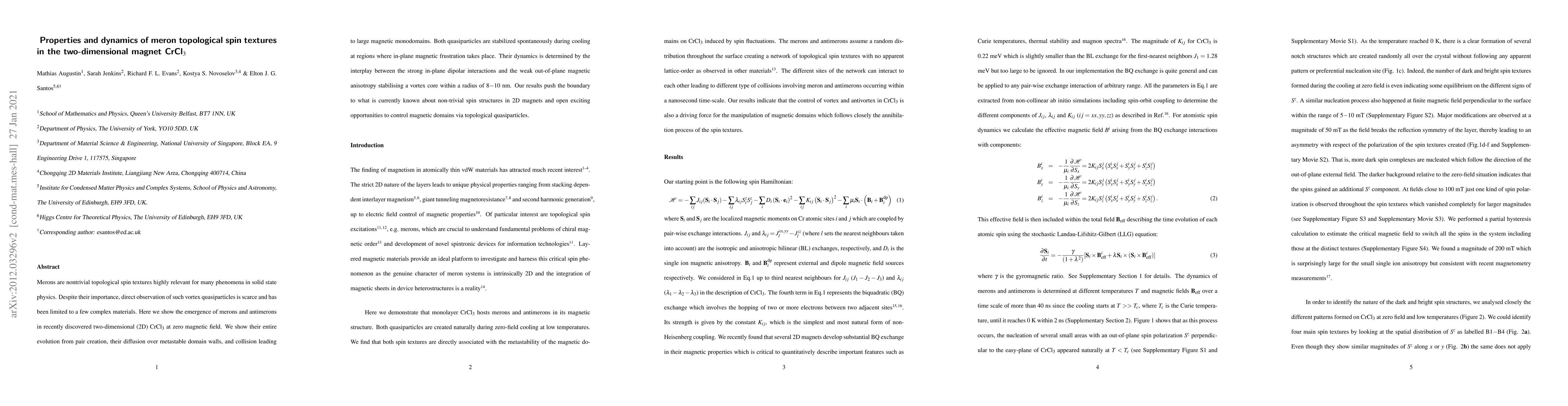 Merons are nontrivial topological spin textures highly relevant for many phenomena in solid state physics. Despite their importance, direct observation of such vortex quasiparticles is scarce and has been limited to a few complex materials. Here we show the emergence of merons and antimerons in recently discovered two-dimensional (2D) CrCl3 at zero magnetic field. We show their entire evolution from pair creation, their diffusion over metastable domain walls, and collision leading to large magnetic monodomains. Both quasiparticles are stabilized spontaneously during cooling at regions where in-plane magnetic frustration takes place. Their dynamics is determined by the interplay between the strong in-plane dipolar interactions and the weak out-of-plane magnetic anisotropy stabilising a vortex core within a radius of 8-10 nm. Our results push the boundary to what is currently known about non-trivial spin structures in 2D magnets and open exciting opportunities to control magnetic domains via topological quasiparticles.