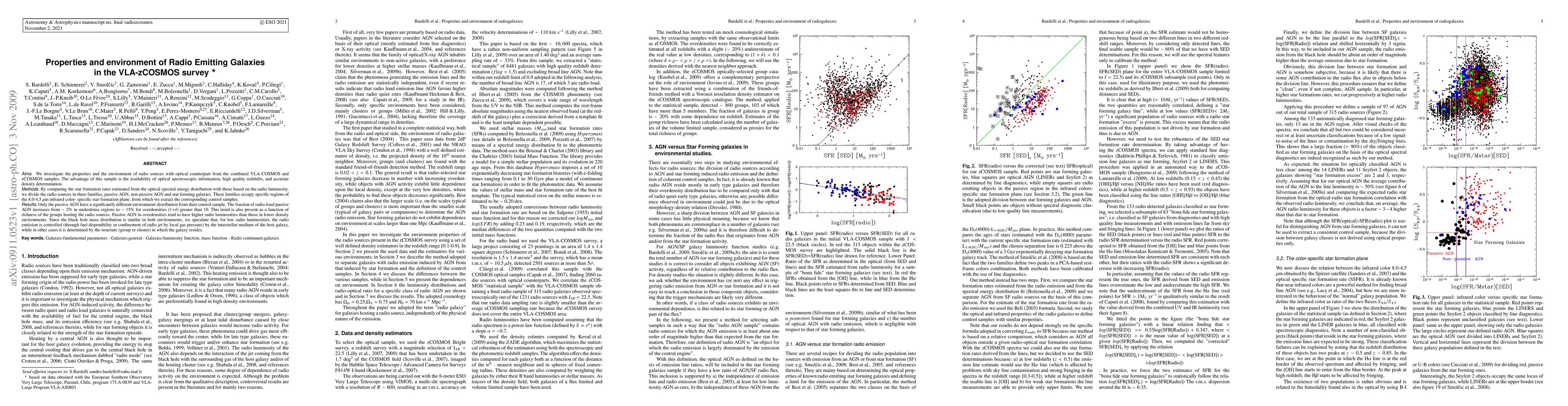 We investigate the properties and the environment of radio sources with optical counterpart from the combined VLA-COSMOS and zCOSMOS samples. The advantage of this sample is the availability of optical spectroscopic information, high quality redshifts, and accurate density determination. By comparing the star formation rates estimated from the optical spectral energy distribution with those based on the radio luminosity, we divide the radio sources in three families, passive AGN, non-passive AGN and star forming galaxies. These families occupy specific regions of the 8.0-4.5 $\mu$m infrared color--specific star formation plane, from which we extract the corresponding control samples. Only the passive AGN have a significantly different environment distribution from their control sample. The fraction of radio-loud passive AGN increases from ~2% in underdense regions to ~15% for overdensities (1+delta) greater than 10. This trend is also present as a function of richness of the groups hosting the radio sources. Passive AGN in overdensities tend to have higher radio luminosities than those in lower density environments. Since the black hole mass distribution is similar in both environments, we speculate that, for low radio luminosities, the radio emission is controlled (through fuel disponibility or confinement of radio jet by local gas pressure) by the interstellar medium of the host galaxy, while in other cases it is determined by the structure (group or cluster) in which the galaxy resides.