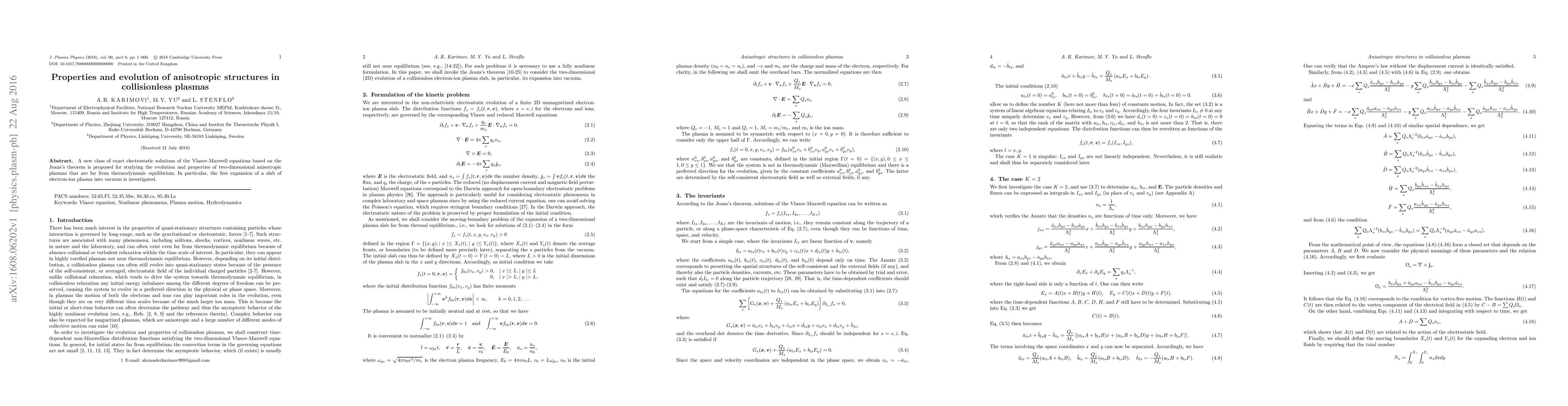 A new class of exact electrostatic solutions of the Vlasov-Maxwell equations based on the Jeans's theorem is proposed for studying the evolution and properties of two-dimensional anisotropic plasmas that are far from thermodynamic equilibrium. In particular, the free expansion of a slab of electron-ion plasma into vacuum is investigated.