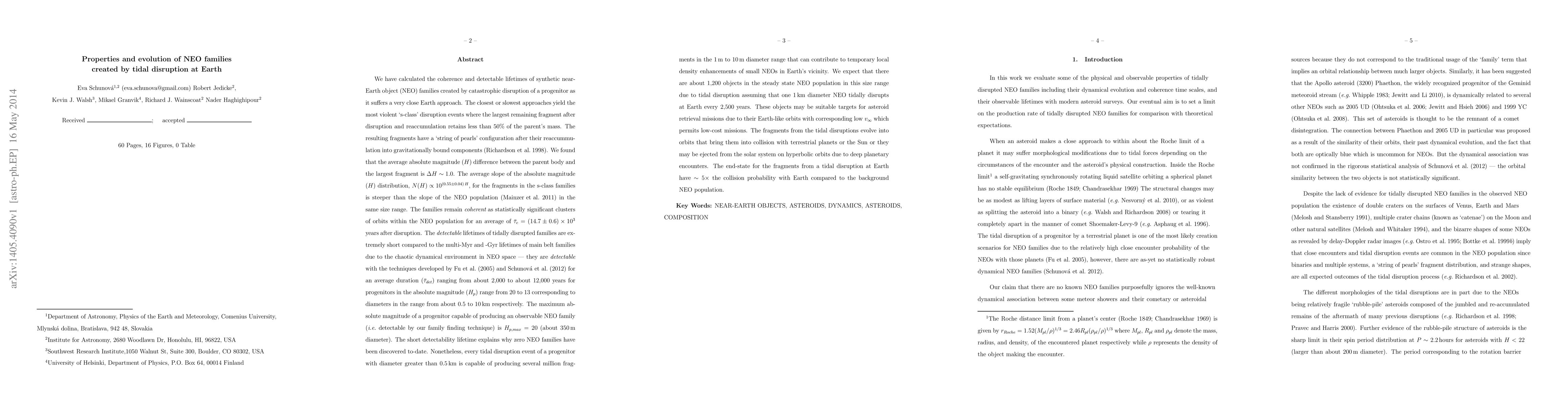 We have calculated the coherence and detectable lifetimes of synthetic near-Earth object (NEO) families created by catastrophic disruption of a progenitor as it suffers a very close Earth approach. The closest or slowest approaches yield the most violent `s-class' disruption events. We found that the average slope of the absolute magnitude (H) distribution, $N(H)\propto10^{(0.55\pm0.04)\,H}$, for the fragments in the s-class families is steeper than the slope of the NEO population \citep{mainzer2011} in the same size range. The families remain coherent as statistically significant clusters of orbits within the NEO population for an average of $\bar\tau_c = (14.7\pm0.6)\times10^3$ years after disruption. The s-class families are detectable with the techniques developed by \citet{fu2005} and \citet{Schunova2012} for an average duration ($\bar\tau_{det}$) ranging from about 2,000 to about 12,000 years for progenitors in the absolute magnitude ($H_p$) range from 20 to 13 corresponding to diameters in the range from about 0.5 to 10$\km$ respectively. The short detectability lifetime explains why zero NEO families have been discovered to-date. Nonetheless, every tidal disruption event of a progenitor with D$>0.5\km$ is capable of producing several million fragments in the $1\meter$ to $10\meter$ diameter range that can contribute to temporary local density enhancements of small NEOs in Earth's vicinity. We expect that there are about 1,200 objects in the steady state NEO population in this size range due to tidal disruption assuming that one $1\km$ diameter NEO tidally disrupts at Earth every 2,500 years. These objects may be suitable targets for asteroid retrieval missions due to their Earth-like orbits with corresponding low $v_{\infty}$. The fragments from the tidal disruptions at Earth have $\sim5\times$ the collision probability with Earth compared to the background NEO population.