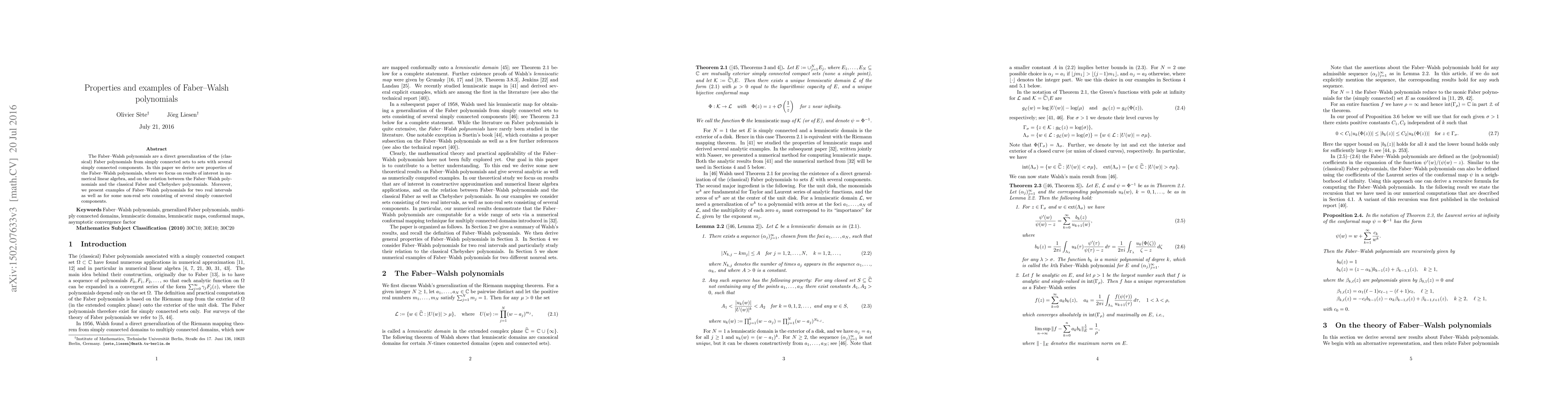 This paper explores the properties and examples of Faber--Walsh polynomials, extending Faber polynomials to sets with multiple simply connected components, and discusses their relevance in numerical linear algebra along with their connections to classical Faber and Chebyshev polynomials. Examples include Faber--Walsh polynomials for two real intervals and non-real sets.