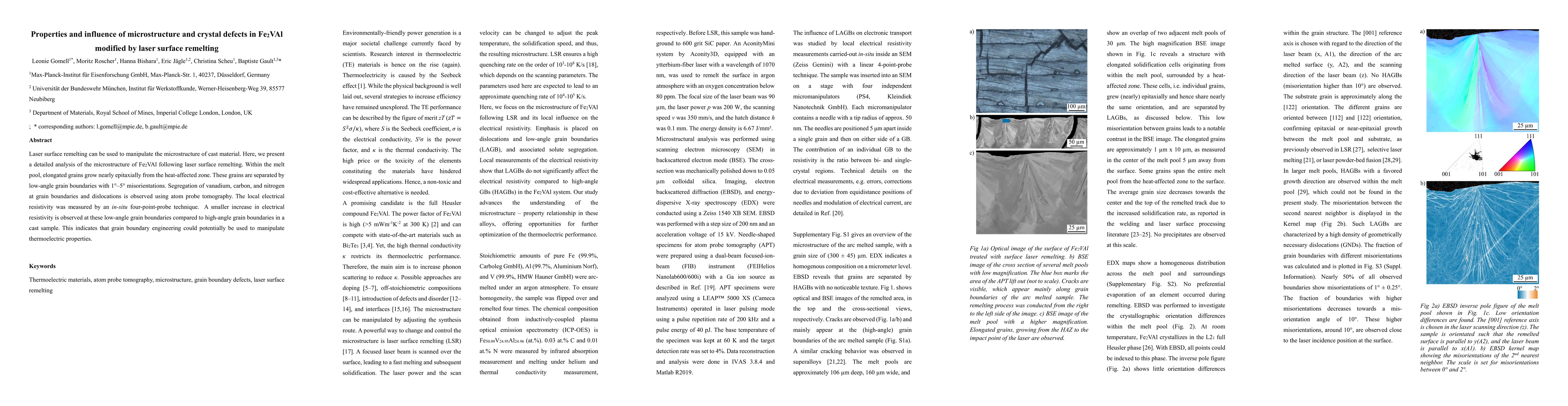Laser surface remelting can be used to manipulate the microstructure of cast material. Here, we present a detailed analysis of the microstructure of Fe$_2$VAl following laser surface remelting. Within the melt pool, elongated grains grow nearly epitaxially from the heat-affected zone. These grains are separated by low-angle grain boundaries with 1{\deg}-5{\deg} misorientations. Segregation of vanadium, carbon, and nitrogen at grain boundaries and dislocations is observed using atom probe tomography. The local electrical resistivity was measured by an in-situ four-point-probe technique. A smaller increase in electrical resistivity is observed at these low-angle grain boundaries compared to high-angle grain boundaries in a cast sample. This indicates that grain boundary engineering could potentially be used to manipulate thermoelectric properties.