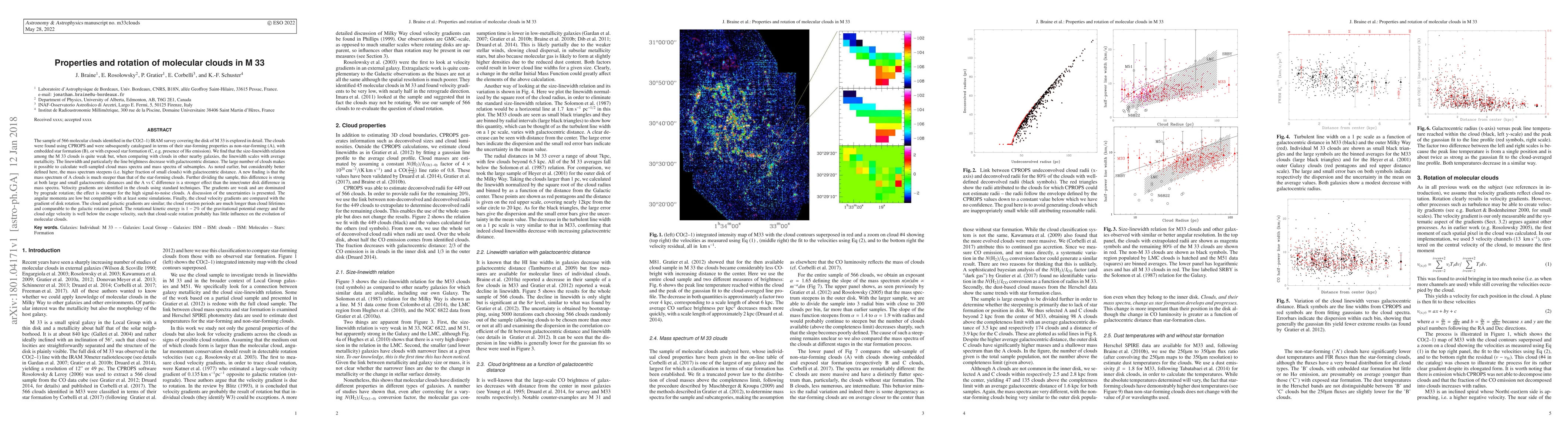 This study analyzes 566 molecular clouds in M 33, finding that their mass spectrum steepens with galactocentric distance, especially for non-star-forming clouds. The rotation of these clouds shows weak velocity gradients dominated by prograde motion, with low angular momenta and minimal impact on cloud evolution.