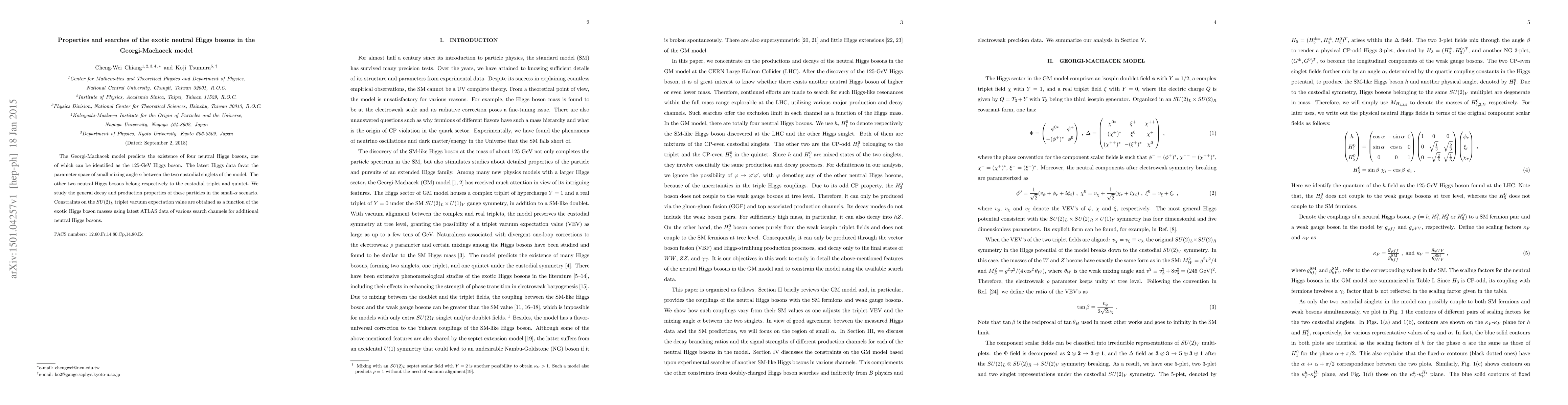The Georgi-Machacek model predicts the existence of four neutral Higgs bosons, one of which can be identified as the 125-GeV Higgs boson. The latest Higgs data favor the parameter space of small mixing angle alpha between the two custodial singlets of the model. The other two neutral Higgs bosons belong respectively to the custodial triplet and quintet. We study the general decay and production properties of these particles in the small-alpha scenario. Constraints on the SU(2)_L triplet vacuum expectation value are obtained as a function of the exotic Higgs boson masses using latest ATLAS data of various search channels for additional neutral Higgs bosons.