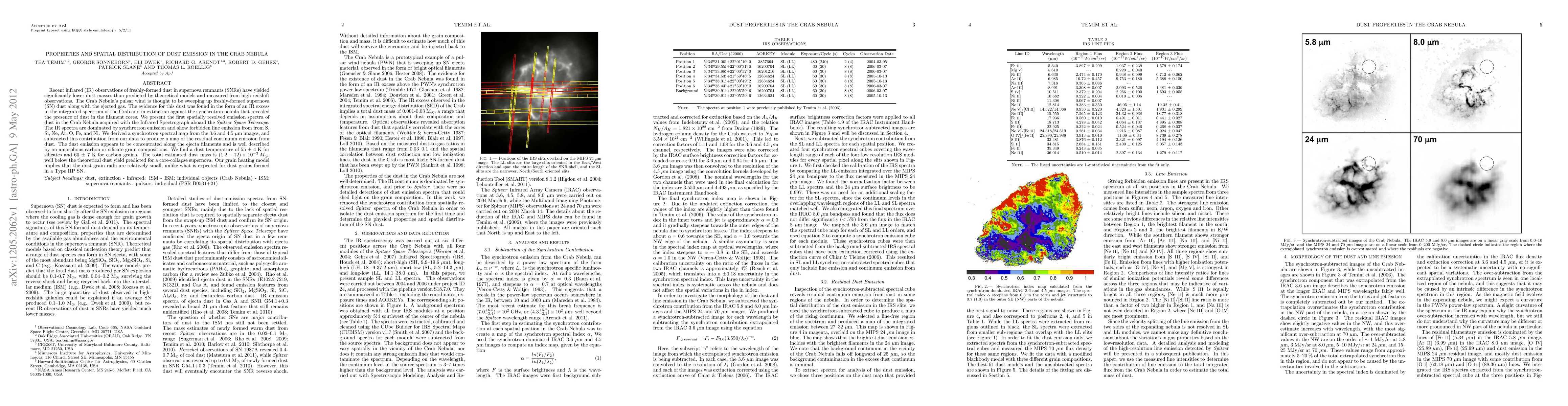 This study reveals the spatial distribution and properties of dust emission in the Crab Nebula, finding dust concentrated along ejecta filaments with temperatures of 55-60 K. The estimated dust mass (0.0012-0.012 solar masses) is significantly lower than theoretical predictions, suggesting small dust grain sizes.
