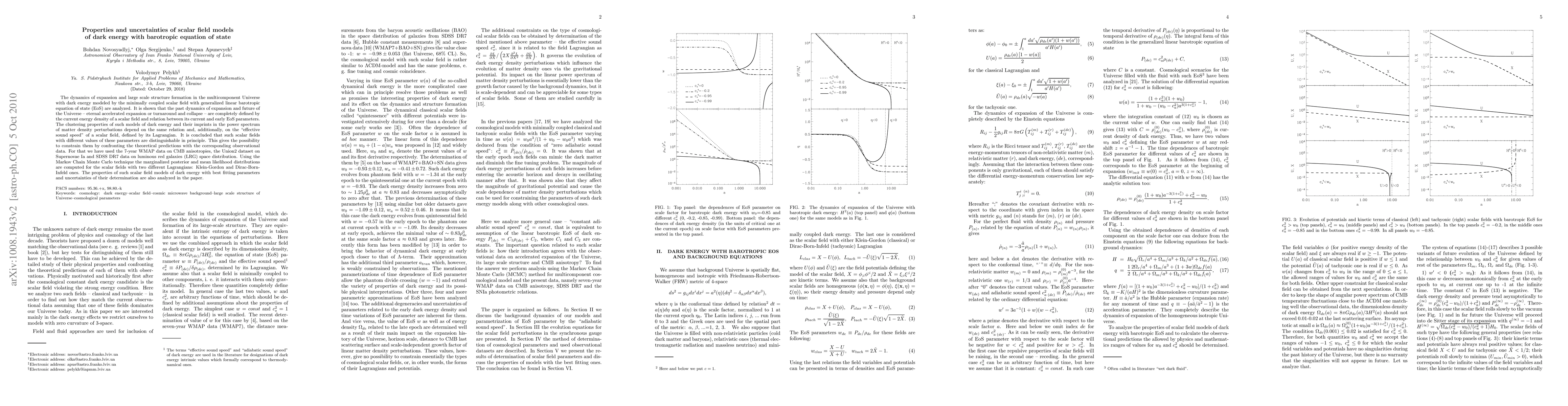 The dynamics of expansion and large scale structure formation in the multicomponent Universe with dark energy modeled by the minimally coupled scalar field with generalized linear barotropic equation of state (EoS) are analyzed. It is shown that the past dynamics of expansion and future of the Universe -- eternal accelerated expansion or turnaround and collapse -- are completely defined by the current energy density of a scalar field and relation between its current and early EoS parameters. The clustering properties of such models of dark energy and their imprints in the power spectrum of matter density perturbations depend on the same relation and, additionally, on the "effective sound speed" of a scalar field, defined by its Lagrangian. It is concluded that such scalar fields with different values of these parameters are distinguishable in principle. This gives the possibility to constrain them by confronting the theoretical predictions with the corresponding observational data. For that we have used the 7-year WMAP data on CMB anisotropies, the Union2 dataset on Supernovae Ia and SDSS DR7 data on luminous red galaxies (LRG) space distribution. Using the Markov Chain Monte Carlo technique the marginalized posterior and mean likelihood distributions are computed for the scalar fields with two different Lagrangians: Klein-Gordon and Dirac-Born-Infeld ones. The properties of such scalar field models of dark energy with best fitting parameters and uncertainties of their determination are also analyzed in the paper.