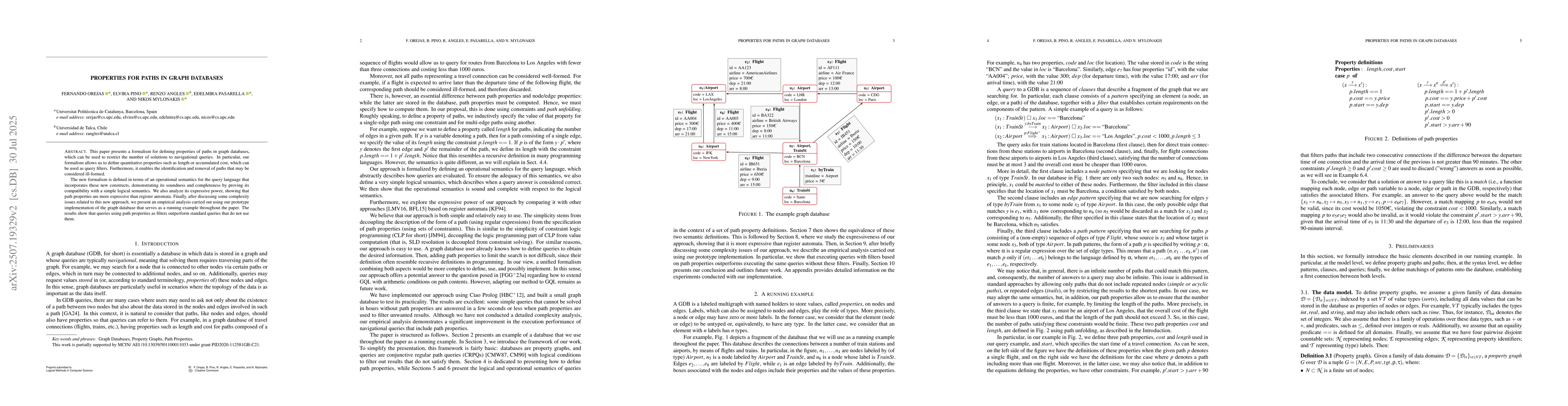 This paper presents a formalism for defining properties of paths in graph databases, which can be used to restrict the number of solutions to navigational queries. In particular, our formalism allows us to define quantitative properties such as length or accumulated cost, which can be used as query filters. Furthermore, it enables the identification and removal of paths that may be considered ill-formed. The new formalism is defined in terms of an operational semantics for the query language that incorporates these new constructs, demonstrating its soundness and completeness by proving its compatibility with a simple logical semantics. We also analyze its expressive power, showing that path properties are more expressive than register automata. Finally, after discussing some complexity issues related to this new approach, we present an empirical analysis carried out using our prototype implementation of the graph database that serves as a running example throughout the paper. The results show that queries using path properties as filters outperform standard queries that do not use them.