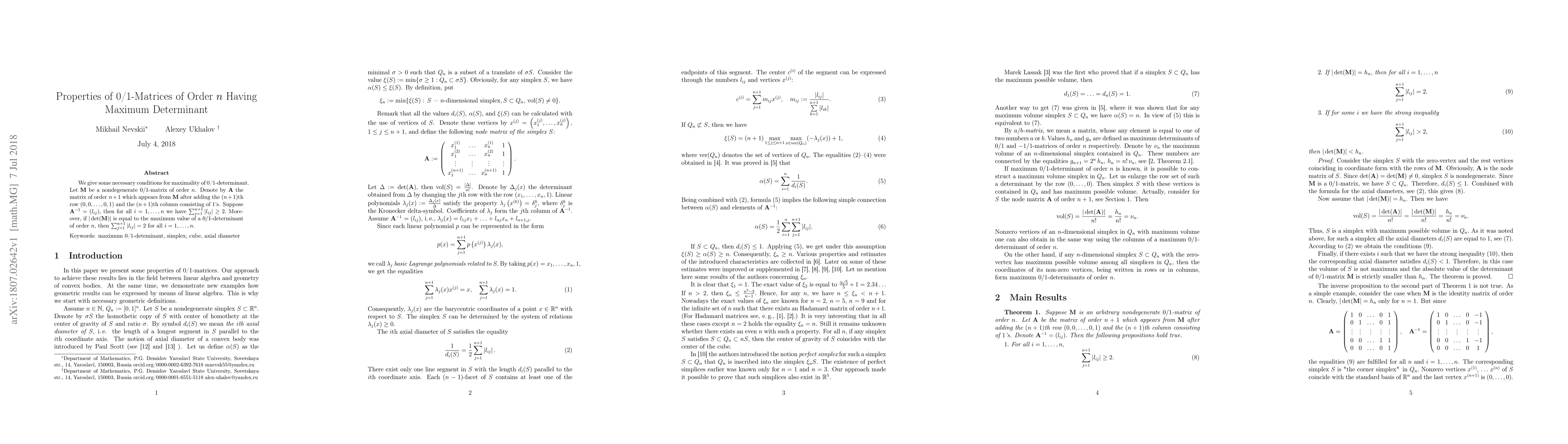 We give some necessary conditions for maximality of $0/1$-determinant. Let ${\bf M}$ be a nondegenerate $0/1$-matrix of order $n$. Denote by $\bf A$ the matrix of order $n+1$ which appears from ${\bf M}$ after adding the $(n+1)$th row $(0,0,\ldots,0,1)$ and the $(n+1)$th column consisting of $1$'s. Suppose ${\bf A}^{-1}=(l_{ij}),$ then for all $i=1,\ldots,n$ we have $\sum_{j=1}^{n+1} |l_{ij}|\geq 2.$ Moreover, if $|\det({\bf M})|$ is equal to the maximum value of a $0/1$-determinant of order $n$, then $\sum_{j=1}^{n+1} |l_{ij}|= 2$ for all $i=1,\ldots,n$. Keywords: maximum 0/1-deteminant, simplex, cube, axial diameter
