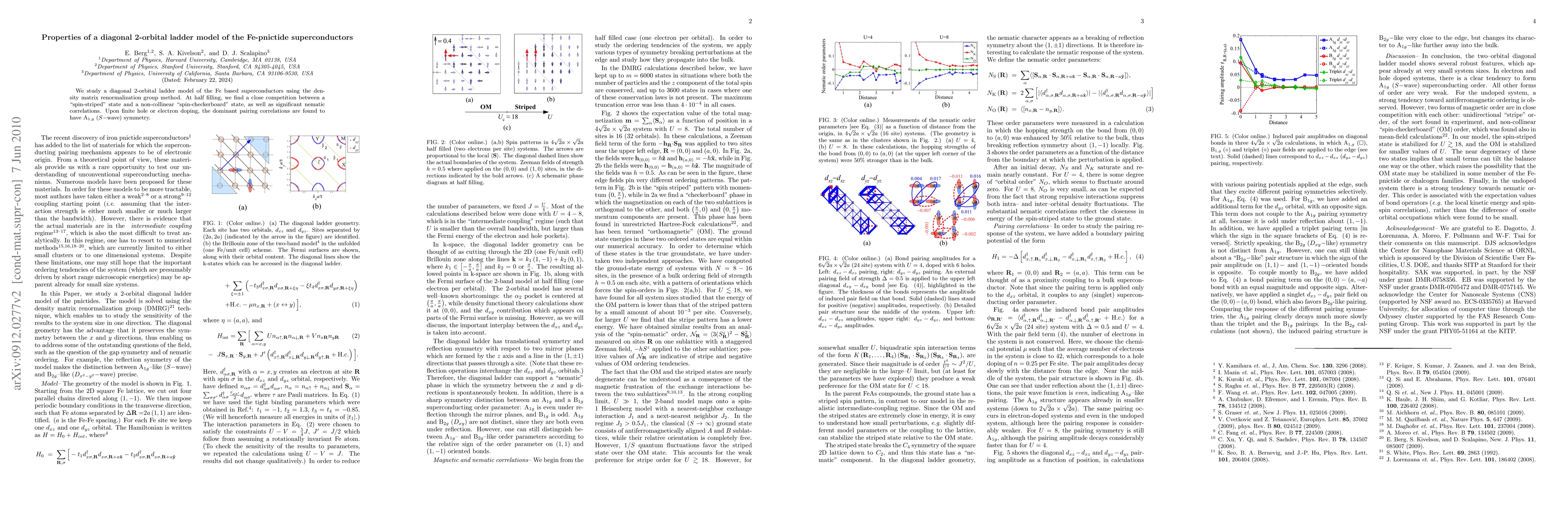 We study a diagonal 2-orbital ladder model of the Fe based superconductors using the density matrix renormalization group method. At half filling, we find a close competition between a "spin-striped" state and a non-collinear "spin-checkerboard" state, as well as significant nematic correlations. Upon finite hole or electron doping, the dominant pairing correlations are found to have A$_{1,g}$ ($S-$wave) symmetry.