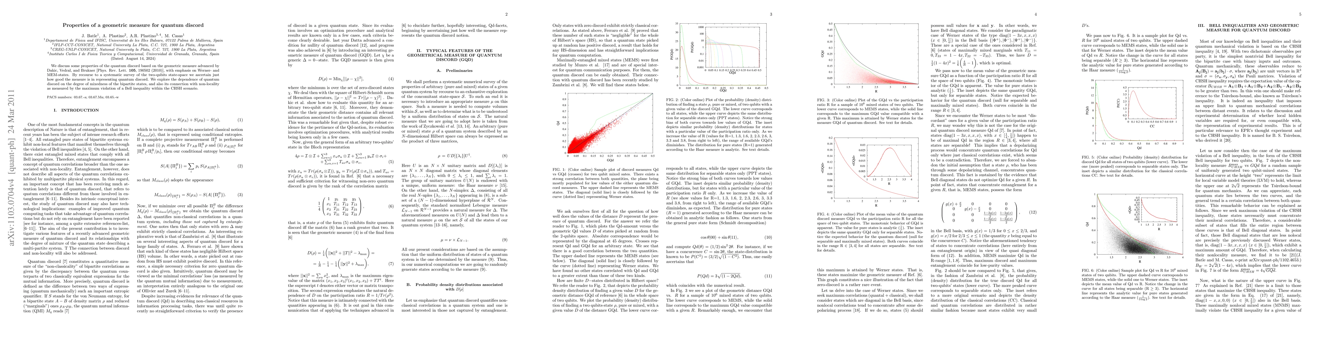 We discuss some properties of the quantum discord based on the geometric distance advanced by Dakic, Vedral, and Brukner [Phys. Rev. Lett. {\bf 105}, 190502 (2010)], with emphasis on Werner- and MEM-states. We ascertain just how good the measure is in representing quantum discord. We explore the dependence of quantum discord on the degree of mixedness of the bipartite states, and also its connection with non-locality as measured by the maximum violation of a Bell inequality within the CHSH scenario.
