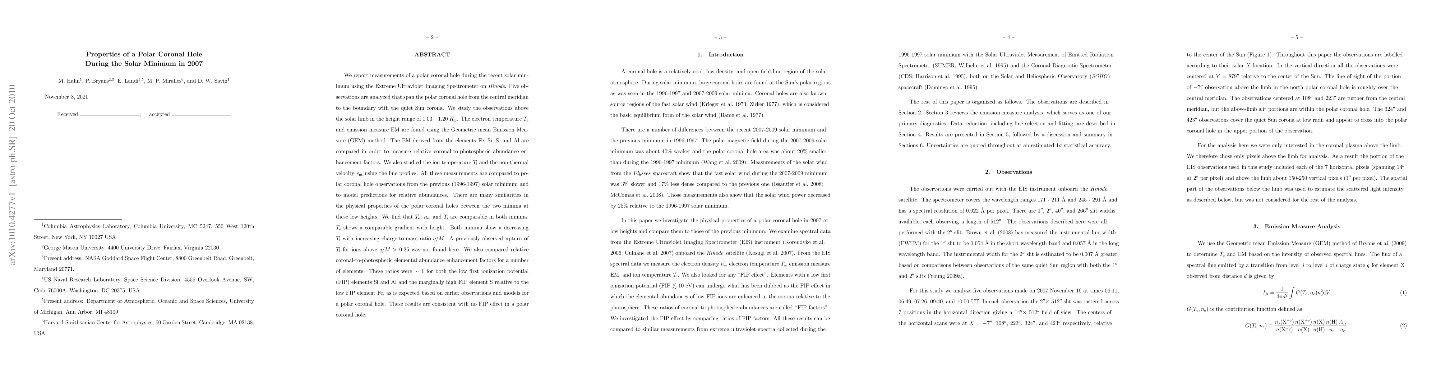 The study analyzes a polar coronal hole during the 2007 solar minimum using the Extreme Ultraviolet Imaging Spectrometer on Hinode, focusing on observations from the central meridian to the boundary with the quiet Sun corona at heights of 1.03 - 1.20 solar radii.