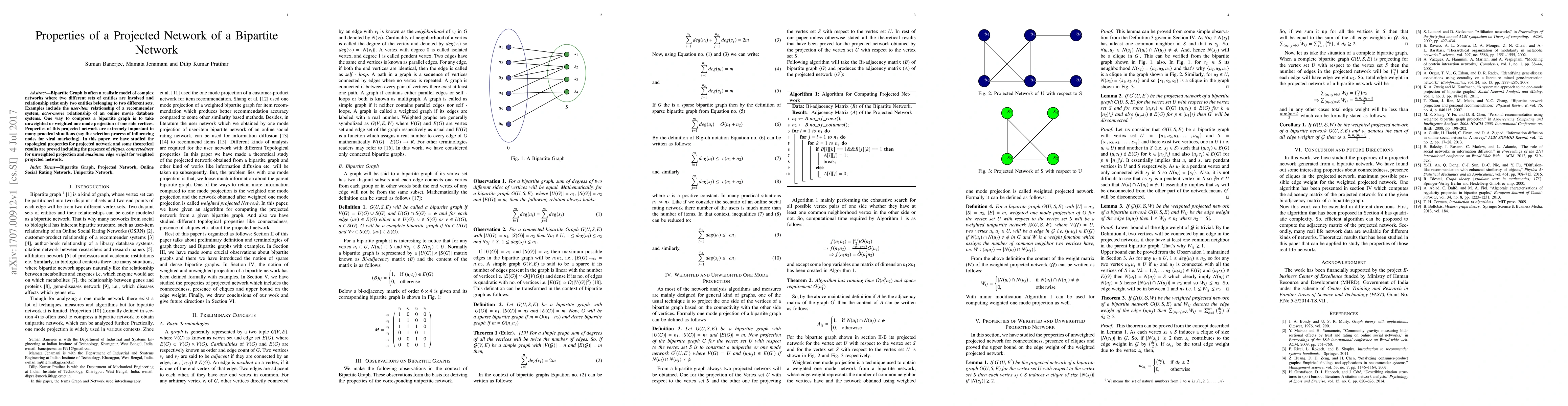 Bipartite Graph is often a realistic model of complex networks where two different sets of entities are involved and relationship exist only two entities belonging to two different sets. Examples include the user-item relationship of a recommender system, actor-movie relationship of an online movie database systems. One way to compress a bipartite graph is to take unweighted or weighted one mode projection of one side vertices. Properties of this projected network are extremely important in many practical situations (say the selection process of influencing nodes for viral marketing). In this paper, we have studied the topological properties for projected network and some theoretical results are proved including the presence of cliques, connectedness for unweighted projection and maximum edge weight for weighted projected network.