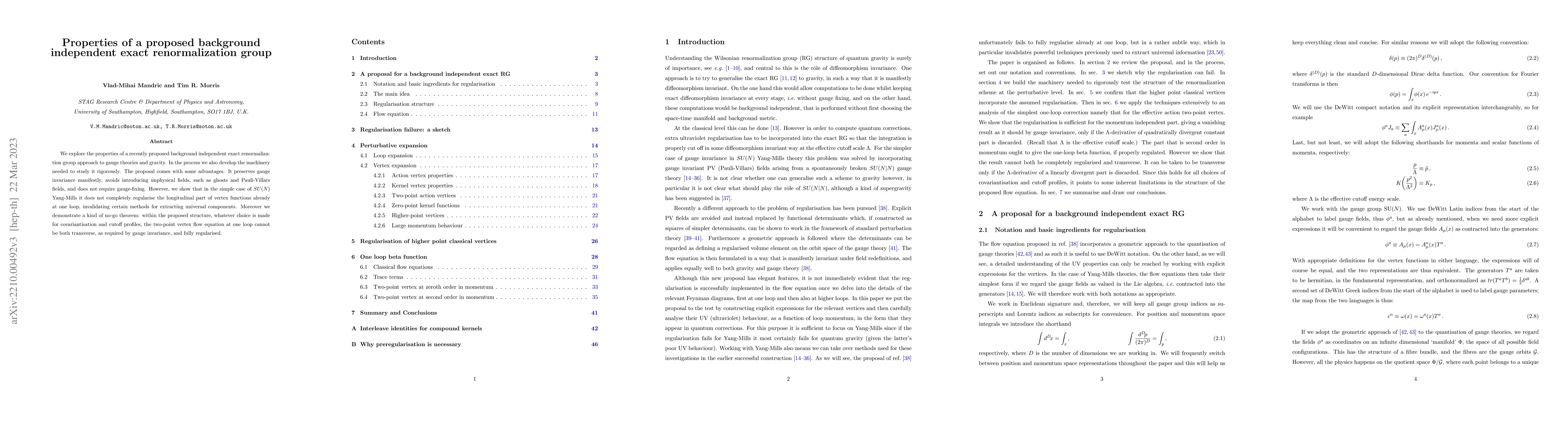 We explore the properties of a recently proposed background independent exact renormalization group approach to gauge theories and gravity. In the process we also develop the machinery needed to study it rigorously. The proposal comes with some advantages. It preserves gauge invariance manifestly, avoids introducing unphysical fields, such as ghosts and Pauli-Villars fields, and does not require gauge-fixing. However, we show that in the simple case of SU(N) Yang-Mills it does not completely regularise the longitudinal part of vertex functions already at one loop, invalidating certain methods for extracting universal components. Moreover we demonstrate a kind of no-go theorem: within the proposed structure, whatever choice is made for covariantisation and cutoff profiles, the two-point vertex flow equation at one loop cannot be both transverse, as required by gauge invariance, and fully regularised.