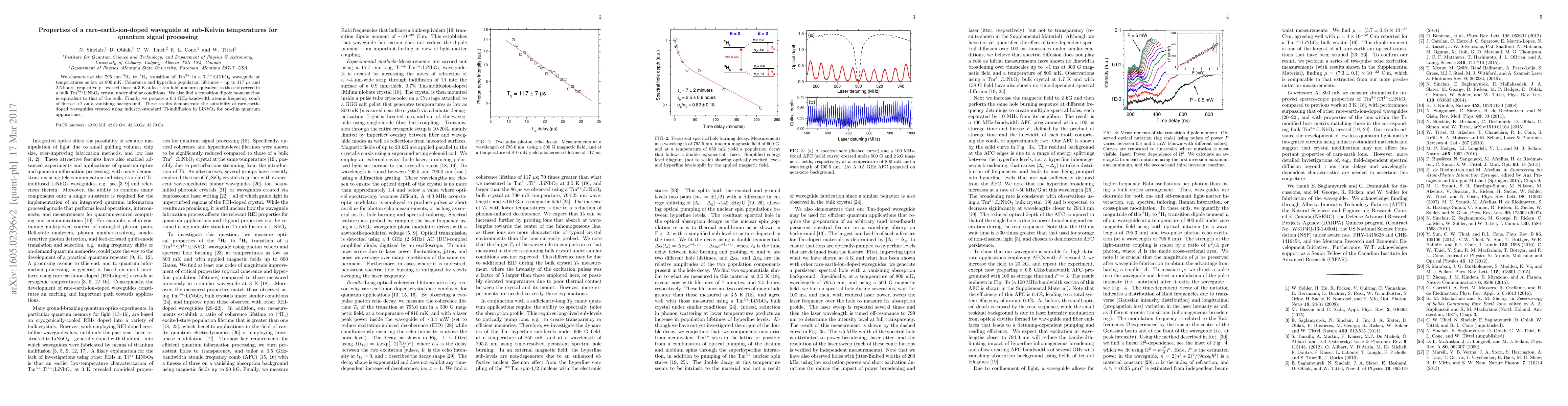 We characterize the 795 nm $^3$H$_6$ to $^3$H$_4$ transition of Tm$^{3+}$ in a Ti$^{4+}$:LiNbO$_{3}$ waveguide at temperatures as low as 800 mK. Coherence and hyperfine population lifetimes -- up to 117 $\mu$s and 2.5 hours, respectively -- exceed those at 3 K at least ten-fold, and are equivalent to those observed in a bulk Tm$^{3+}$:LiNbO$_{3}$ crystal under similar conditions. We also find a transition dipole moment that is equivalent to that of the bulk. Finally, we prepare a 0.5 GHz-bandwidth atomic frequency comb of finesse $>$2 on a vanishing background. These results demonstrate the suitability of rare-earth-doped waveguides created using industry-standard Ti-indiffusion in LiNbO$_3$ for on-chip quantum applications.