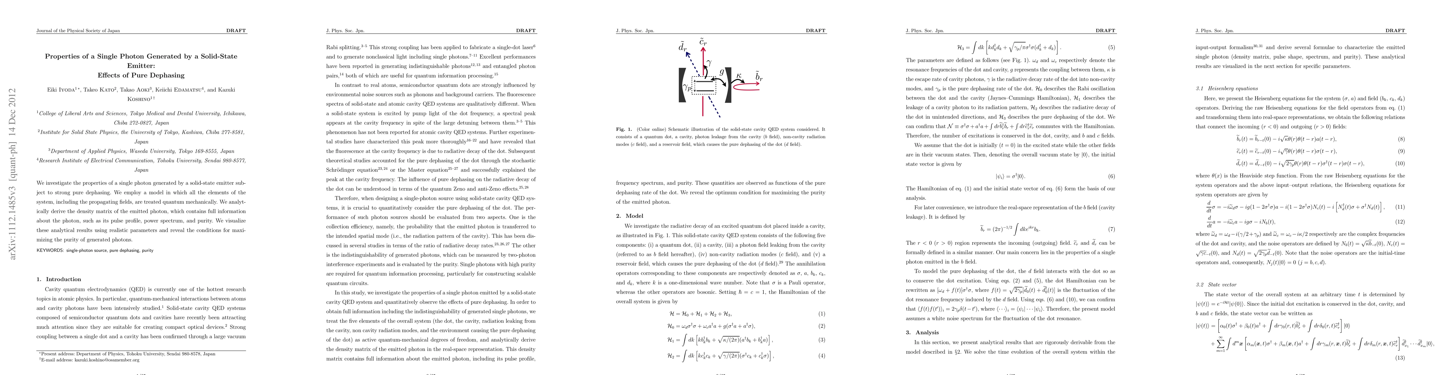 This research investigates the properties of a single photon emitted by a solid-state emitter under strong pure dephasing, employing a quantum mechanical model. The study analytically derives the photon's density matrix, revealing its pulse profile, power spectrum, and purity, and identifies conditions for maximizing photon purity.