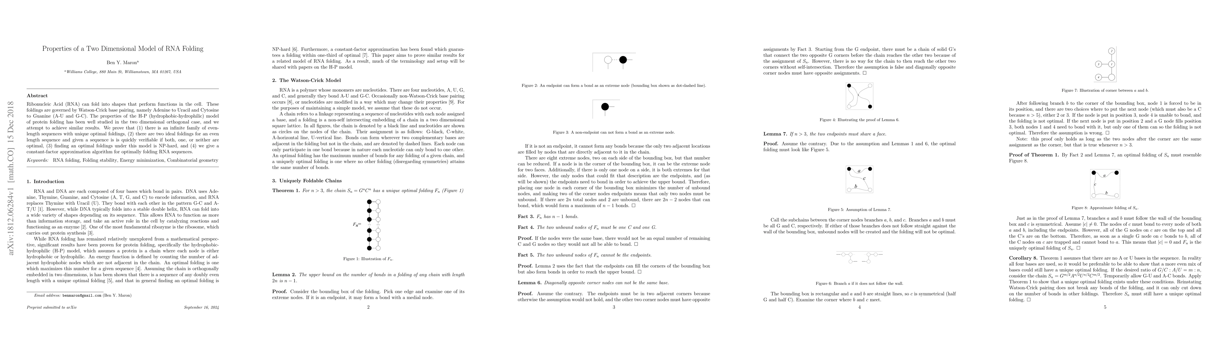 Ribonucleic Acid (RNA) can fold into shapes that perform functions in the cell. These foldings are governed by Watson-Crick base pairing, namely Adenine to Uracil and Cytosine to Guanine (A-U and G-C). The properties of the H-P (hydrophobic-hydrophilic) model of protein folding has been well studied in the two dimensional orthogonal case, and we attempt to achieve similar results. We prove that (1) there is an infinite family of even-length sequences with unique optimal foldings, (2) there are two ideal foldings for an even length sequence and given a sequence is is quickly verifiable if both, one, or neither are optimal, (3) finding an optimal foldings under this model is NP-hard, and (4) we give a constant-factor approximation algorithm for optimally folding RNA sequences.