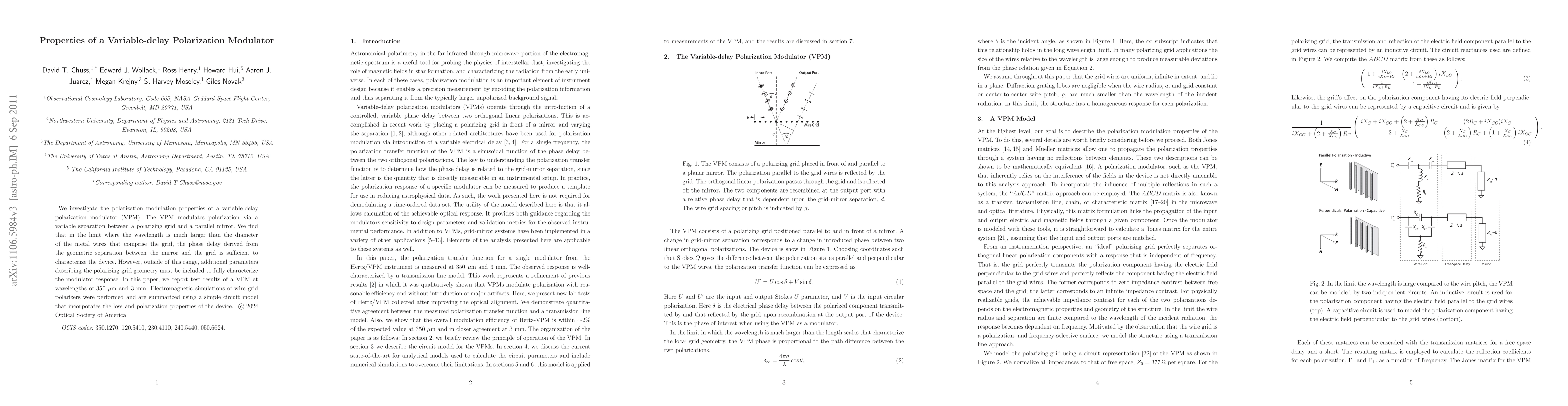 We investigate the polarization modulation properties of a variable-delay polarization modulator (VPM). The VPM modulates polarization via a variable separation between a polarizing grid and a parallel mirror. We find that in the limit where the wavelength is much larger than the diameter of the metal wires that comprise the grid, the phase delay derived from the geometric separation between the mirror and the grid is sufficient to characterize the device. However, outside of this range, additional parameters describing the polarizing grid geometry must be included to fully characterize the modulator response. In this paper, we report test results of a VPM at wavelengths of 350 microns and 3 mm. Electromagnetic simulations of wire grid polarizers were performed and are summarized using a simple circuit model that incorporates the loss and polarization properties of the device.