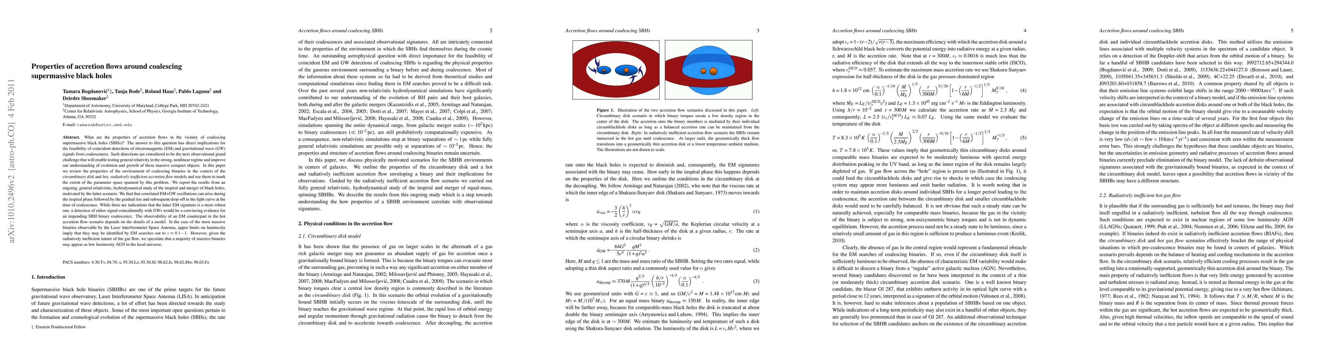 What are the properties of accretion flows in the vicinity of coalescing supermassive black holes (SBHs)? The answer to this question has direct implications for the feasibility of coincident detections of electromagnetic (EM) and gravitational wave (GW) signals from coalescences. Such detections are considered to be the next observational grand challenge that will enable testing general relativity in the strong, nonlinear regime and improve our understanding of evolution and growth of these massive compact objects. In this paper we review the properties of the environment of coalescing binaries in the context of the circumbinary disk and hot, radiatively inefficient accretion flow models and use them to mark the extent of the parameter space spanned by this problem. We report the results from an ongoing, general relativistic, hydrodynamical study of the inspiral and merger of black holes, motivated by the latter scenario. We find that correlated EM+GW oscillations can arise during the inspiral phase followed by the gradual rise and subsequent drop-off in the light curve at the time of coalescence. While there are indications that the latter EM signature is a more robust one, a detection of either signal coincidentally with GWs would be a convincing evidence for an impending SBH binary coalescence. The observability of an EM counterpart in the hot accretion flow scenario depends on the details of a model. In the case of the most massive binaries observable by the Laser Interferometer Space Antenna, upper limits on luminosity imply that they may be identified by EM searches out to z~0.1-1. However, given the radiatively inefficient nature of the gas flow, we speculate that a majority of massive binaries may appear as low luminosity AGN in the local universe.