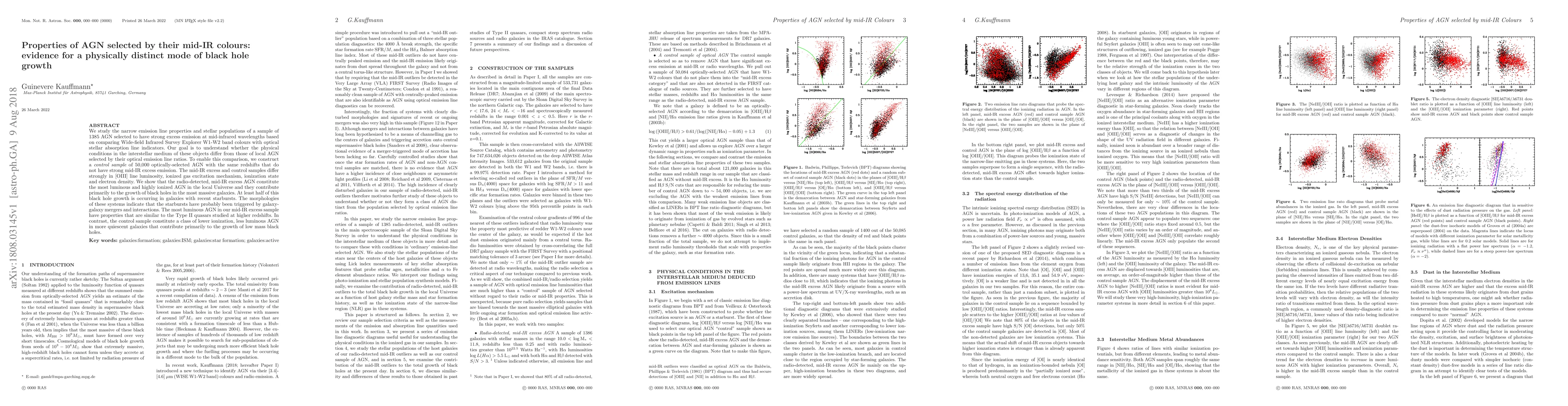 This paper investigates the properties of AGN selected by their mid-IR colours, finding that they exhibit distinct physical conditions compared to optically-selected AGN. The mid-IR excess AGN are more luminous, highly ionized, and primarily grow black holes in massive galaxies, often with recent starburst activity due to mergers.