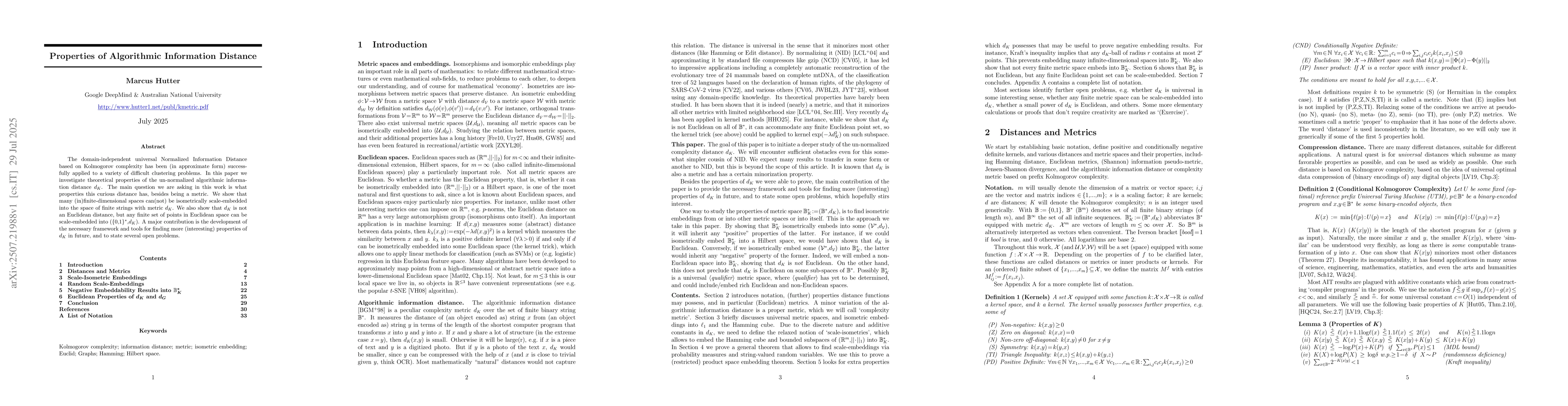 The domain-independent universal Normalized Information Distance based on Kolmogorov complexity has been (in approximate form) successfully applied to a variety of difficult clustering problems. In this paper we investigate theoretical properties of the un-normalized algorithmic information distance $d_K$. The main question we are asking in this work is what properties this curious distance has, besides being a metric. We show that many (in)finite-dimensional spaces can(not) be isometrically scale-embedded into the space of finite strings with metric $d_K$. We also show that $d_K$ is not an Euclidean distance, but any finite set of points in Euclidean space can be scale-embedded into $(\{0,1\}^*,d_K)$. A major contribution is the development of the necessary framework and tools for finding more (interesting) properties of $d_K$ in future, and to state several open problems.