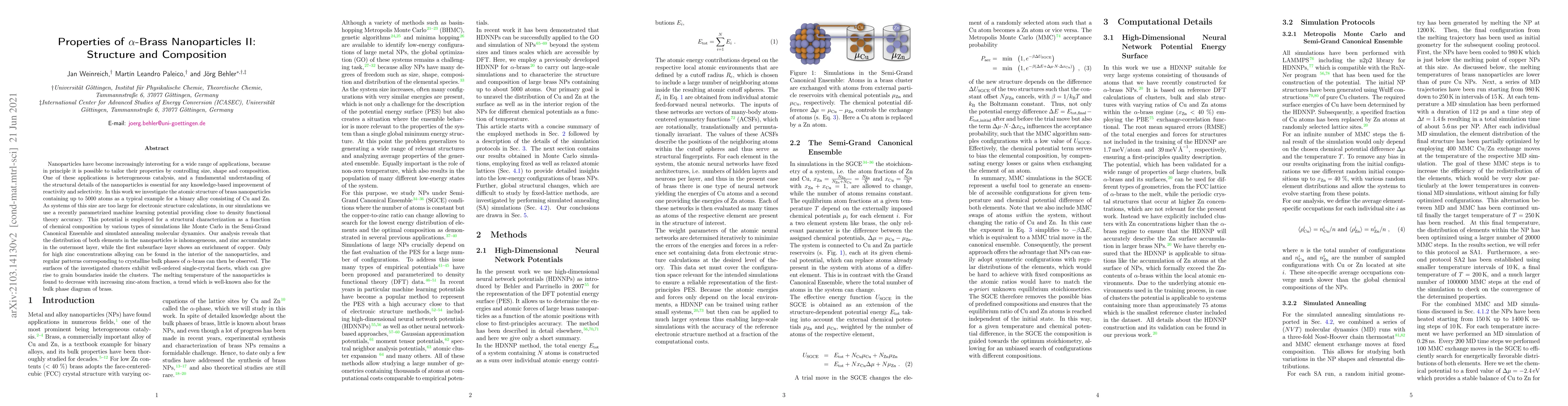Nanoparticles have become increasingly interesting for a wide range of applications, because in principle it is possible to tailor their properties by controlling size, shape and composition. One of these applications is heterogeneous catalysis, and a fundamental understanding of the structural details of the nanoparticles is essential for any knowledge-based improvement of reactivity and selectivity. In this work we investigate the atomic structure of brass nanoparticles containing up to 5000 atoms as a typical example for a binary alloy consisting of Cu and Zn. As systems of this size are too large for electronic structure calculations, in our simulations we use a recently parametrized machine learning potential providing close to density functional theory accuracy. This potential is employed for a structural characterization as a function of chemical composition by various types of simulations like Monte Carlo in the Semi-Grand Canonical Ensemble and simulated annealing molecular dynamics. Our analysis reveals that the distribution of both elements in the nanoparticles is inhomogeneous, and zinc accumulates in the outermost layer, while the first subsurface layer shows an enrichment of copper. Only for high zinc concentrations alloying can be found in the interior of the nanoparticles, and regular patterns corresponding to crystalline bulk phases of $\alpha$-brass can then be observed. The surfaces of the investigated clusters exhibit well-ordered single-crystal facets, which can give rise to grain boundaries inside the clusters. The melting temperature of the nanoparticles is found to decrease with increasing zinc-atom fraction, a trend which is well-known also for the bulk phase diagram of brass.