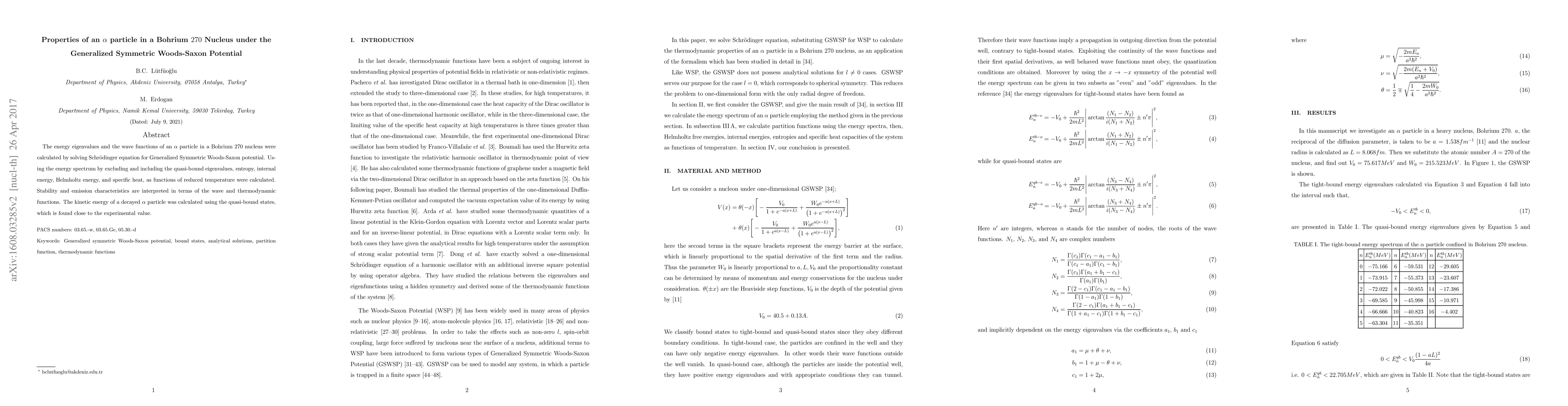 The energy eigenvalues and the wave functions of an $\alpha$ particle in a Bohrium $270$ nucleus were calculated by solving Schr\"odinger equation for Generalized Symmetric Woods-Saxon potential. Using the energy spectrum by excluding and including the quasi-bound eigenvalues, entropy, internal energy, Helmholtz energy, and specific heat, as functions of reduced temperature were calculated. Stability and emission characteristics are interpreted in terms of the wave and thermodynamic functions. The kinetic energy of a decayed $\alpha$ particle was calculated using the quasi-bound states, which is found close to the experimental value.