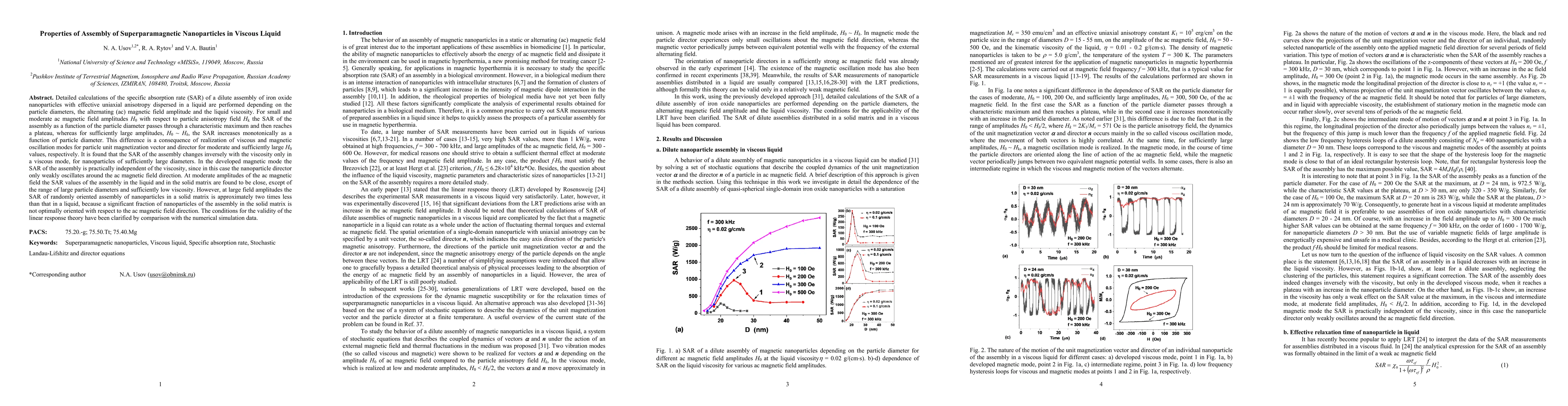 Detailed calculations of the specific absorption rate (SAR) of a dilute assembly of iron oxide nanoparticles with effective uniaxial anisotropy dispersed in a liquid are performed depending on the particle diameters, the alternating (ac) magnetic field amplitude and the liquid viscosity. For small and moderate ac magnetic field amplitudes H0 with respect to particle anisotropy field Hk the SAR of the assembly as a function of the particle diameter passes through a characteristic maximum and then reaches a plateau, whereas for sufficiently large amplitudes, H0 ~ Hk, the SAR increases monotonically as a function of particle diameter. This difference is a consequence of realization of viscous and magnetic oscillation modes for particle unit magnetization vector and director for moderate and sufficiently large H0 values, respectively. It is found that the SAR of the assembly changes inversely with the viscosity only in a viscous mode, for nanoparticles of sufficiently large diameters. In the developed magnetic mode the SAR of the assembly is practically independent of the viscosity, since in this case the nanoparticle director only weakly oscillates around the ac magnetic field direction. At moderate amplitudes of the ac magnetic field the SAR values of the assembly in the liquid and in the solid matrix are found to be close, except of the range of large particle diameters and sufficiently low viscosity. However, at large field amplitudes the SAR of randomly oriented assembly of nanoparticles in a solid matrix is approximately two times less than that in a liquid, because a significant fraction of nanoparticles of the assembly in the solid matrix is not optimally oriented with respect to the ac magnetic field direction. The conditions for the validity of the linear response theory have been clarified by comparison with the numerical simulation data.