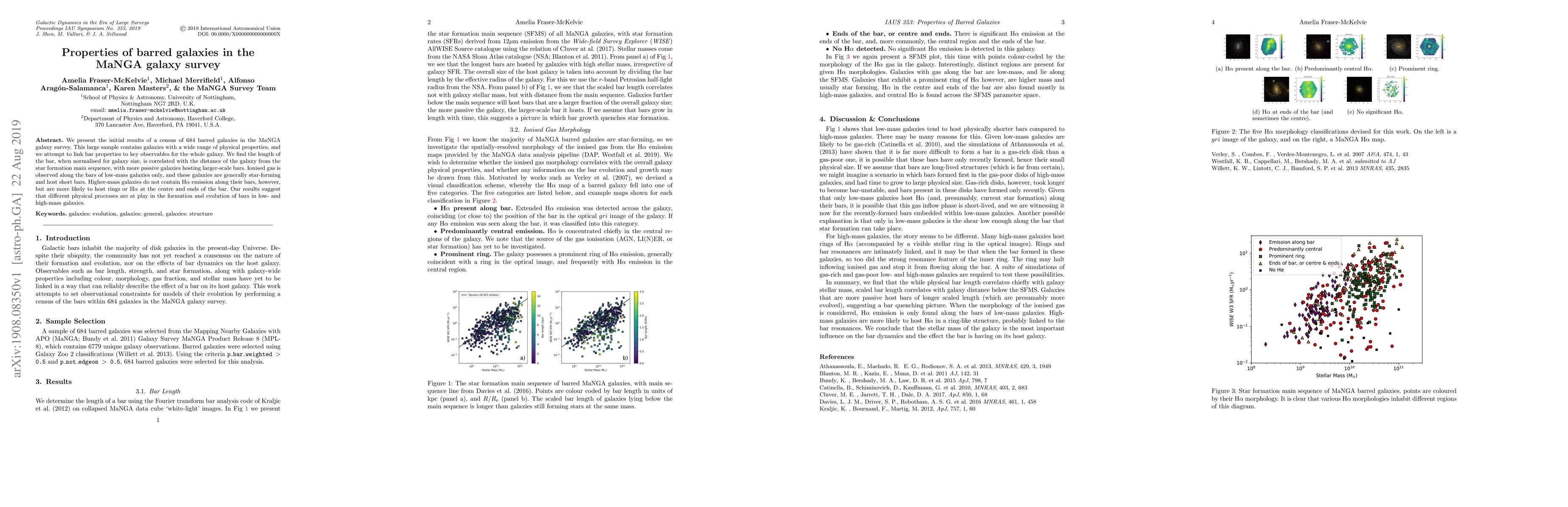 We present the initial results of a census of 684 barred galaxies in the MaNGA galaxy survey. This large sample contains galaxies with a wide range of physical properties, and we attempt to link bar properties to key observables for the whole galaxy. We find the length of the bar, when normalised for galaxy size, is correlated with the distance of the galaxy from the star formation main sequence, with more passive galaxies hosting larger-scale bars. Ionised gas is observed along the bars of low-mass galaxies only, and these galaxies are generally star-forming and host short bars. Higher-mass galaxies do not contain H{\alpha} emission along their bars, however, but are more likely to host rings or H{\alpha} at the centre and ends of the bar. Our results suggest that different physical processes are at play in the formation and evolution of bars in low- and high-mass galaxies.