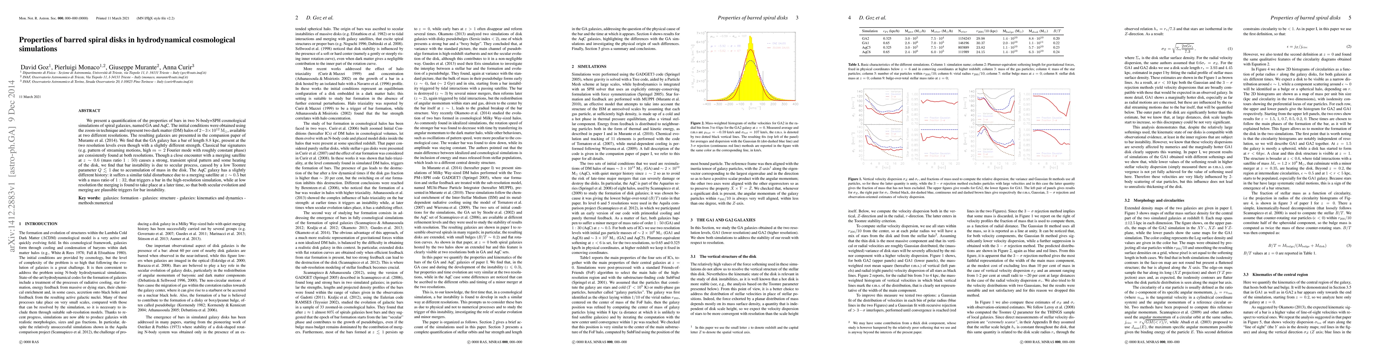 We present a quantification of the properties of bars in two N-body+SPH cosmological simulations of spiral galaxies, named GA and AqC. The initial conditions were obtained using the zoom-in technique and represent two dark matter (DM) halos of $2-3\times10^{12}\ {\rm M}_\odot$, available at two different resolutions. The resulting galaxies are presented in the companion paper of Murante et al. (2014). We find that the GA galaxy has a bar of length $8.8$ kpc, present at the two resolution levels even though with a slightly different strength. Classical bar signatures (e.g. pattern of streaming motions, high $m=2$ Fourier mode with roughly constant phase) are consistently found at both resolutions. Though a close encounter with a merging satellite at $z\sim0.6$ (mass ratio $1:50$) causes a strong, transient spiral pattern and some heating of the disk, we find that bar instability is due to secular process, caused by a low Toomre parameter $Q\lesssim1$ due to accumulation of mass in the disk. The AqC galaxy has a slightly different history: it suffers a similar tidal disturbance due to a merging satellite at $z\sim0.5$ but with a mass ratio of $1:32$, that triggers a bar in the high-resolution simulation, while at low resolution the merging is found to take place at a later time, so that both secular evolution and merging are plausible triggers for bar instability.