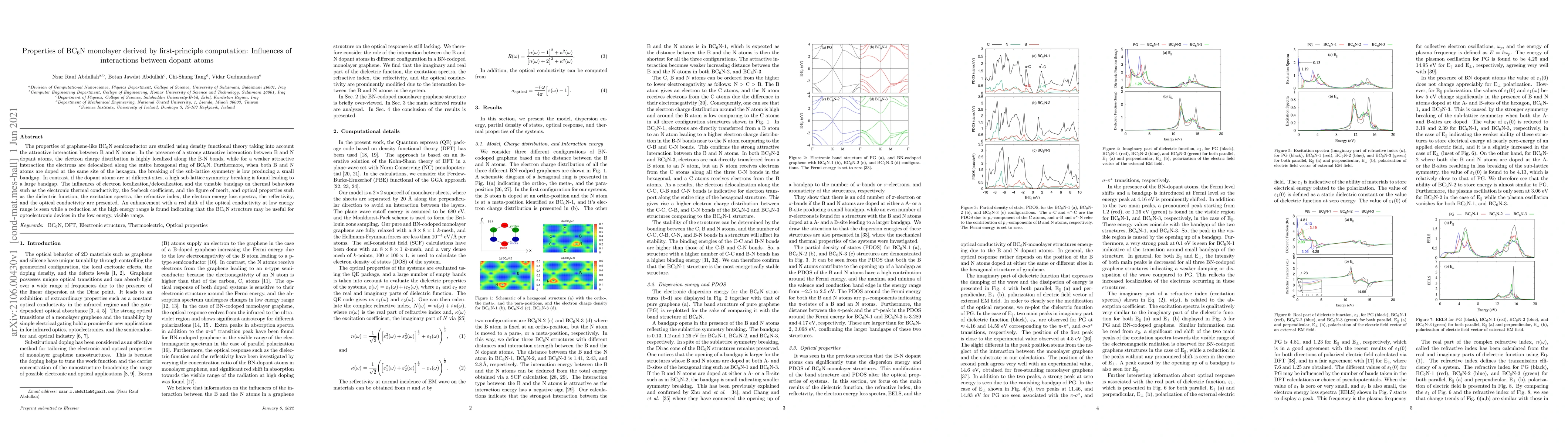 This study investigates the properties of BC$_6$N monolayer using density functional theory, revealing that electron charge distribution and bandgap are significantly influenced by the interaction strength between B and N dopant atoms. The material exhibits tunable electronic and optical properties, making it potentially useful for optoelectronic devices in the visible range.