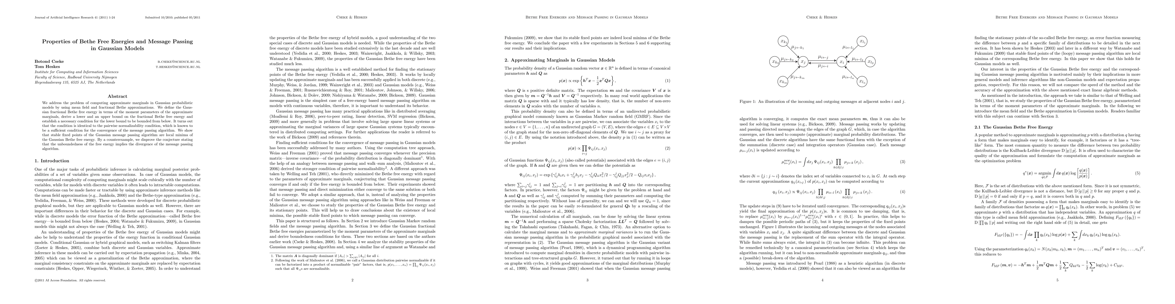 This paper explores the computation of approximate marginals in Gaussian models using mean field and fractional Bethe approximations. It establishes bounds for the Gaussian fractional Bethe free energy and shows that stable fixed points of the message passing algorithm correspond to local minima of this free energy, while disproving the conjecture that unbounded free energy leads to algorithm divergence.