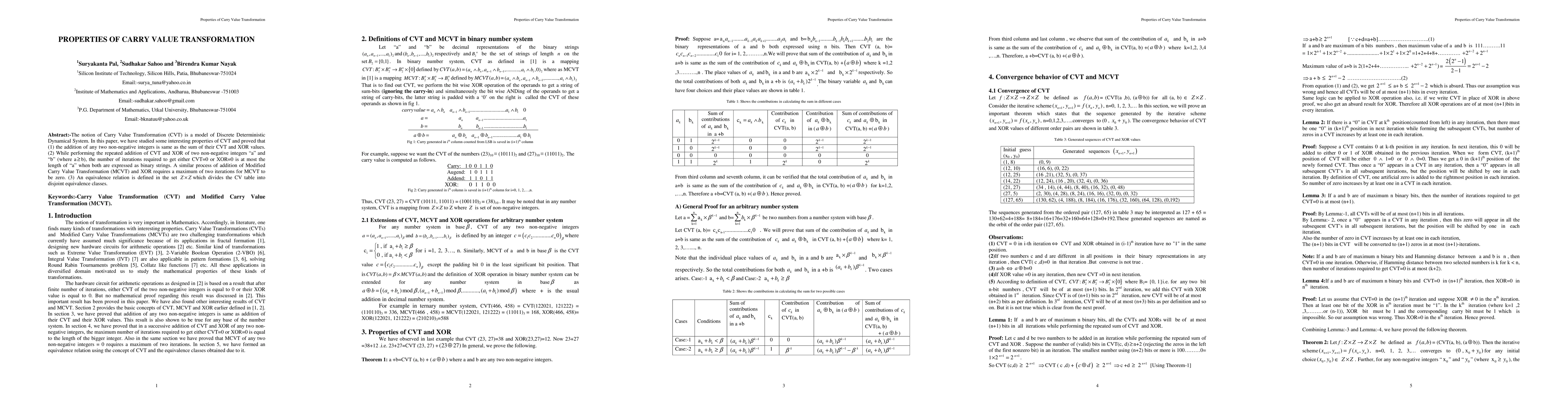 The notion of Carry Value Transformation (CVT) is a model of Discrete Deterministic Dynamical System. In this paper, we have studied some interesting properties of CVT and proved that (1) the addition of any two non-negative integers is same as the sum of their CVT and XOR values. (2) While performing the repeated addition of CVT and XOR of two non-negative integers "a" and "b" (where a >= b), the number of iterations required to get either CVT=0 or XOR=0 is at most the length of "a" when both are expressed as binary strings. A similar process of addition of Modified Carry Value Transformation (MCVT) and XOR requires a maximum of two iterations for MCVT to be zero. (3) An equivalence relation is defined in the set (Z x Z) which divides the CV table into disjoint equivalence classes.