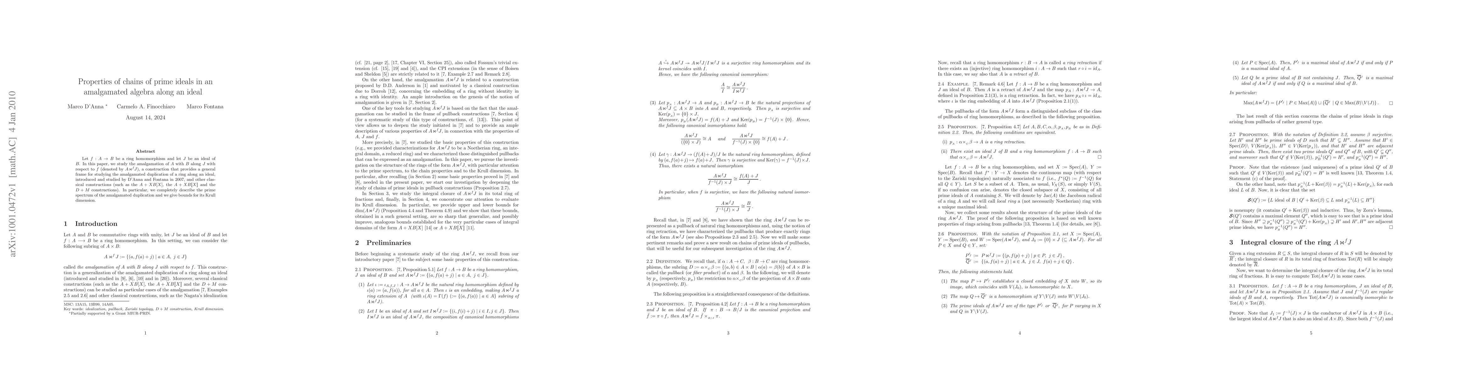 This paper explores the amalgamation of rings A and B along an ideal J, generalizing earlier work on ring duplication. It fully describes the prime spectrum of the amalgamated duplication and provides bounds for its Krull dimension, offering insights into various classical constructions.