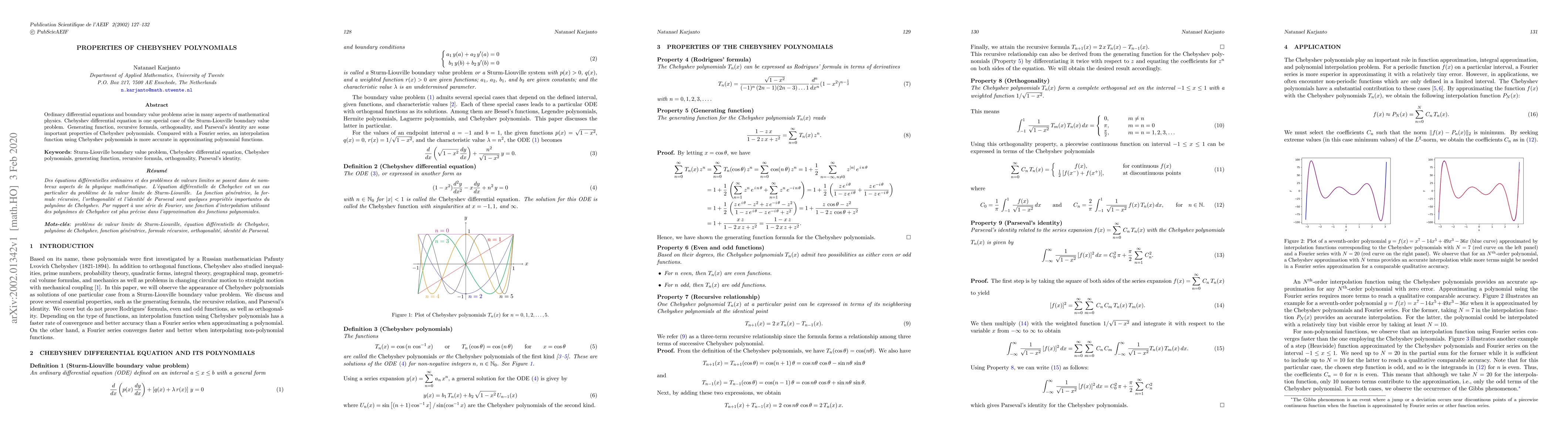 This paper explores the properties of Chebyshev polynomials, focusing on their role in solving ordinary differential equations and boundary value problems in mathematical physics. It highlights their generating function, recursive formula, orthogonality, and Parseval's identity, demonstrating their superior accuracy in polynomial function approximation compared to Fourier series. Ce document examine les propriétés des polynômes de Chebyshev, en se concentrant sur leur rôle dans la résolution d'équations différentielles ordinaires et de problèmes de valeurs limites en physique mathématique. Il met en évidence leur fonction génératrice, leur formule récursive, leur orthogonalité et l'identité de Parseval, montrant leur précision supérieure dans l'approximation des fonctions polynomiales par rapport à une série de Fourier.