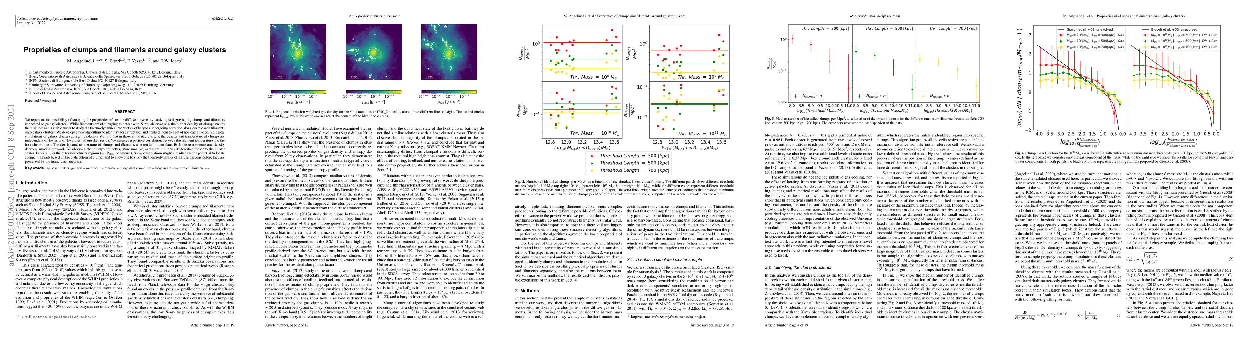This research utilizes high-resolution cosmological simulations from the ENZO code to study the properties of clumps and filaments connected to galaxy clusters. New algorithms were developed to identify these structures, focusing on their density, temperature, mass, and volume.