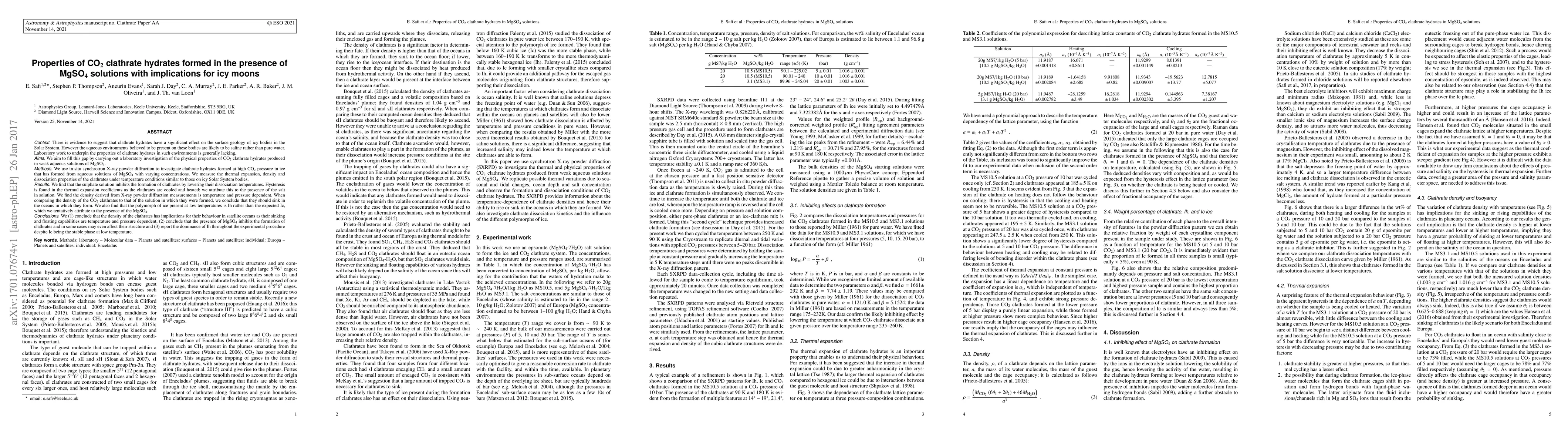 There is evidence to suggest that clathrate hydrates have a significant effect on the surface geology of icy bodies in the Solar System. However the aqueous environments believed to be present on these bodies are likely to be saline rather than pure water. Laboratory work to underpin the properties of clathrates in such environments is lacking. We fill this gap by carrying out a laboratory investigation of the physical properties of CO$_2$ clathrates produced in weak aqueous solutions of MgSO$_4$. We use synchrotron X-ray powder diffraction to investigate clathrates formed at high CO$_2$ pressure in ice that has formed from aqueous solutions of MgSO$_4$. We measure the thermal expansion, density and dissociation properties of the clathrates under temperature conditions similar to those on icy Solar System bodies. We find that the sulphate solution inhibits the formation of clathrates by lowering their dissociation temperatures. Hysteresis is found in the thermal expansion coefficients as clathrates are cooled and heated; we attribute this to the presence of the salt in solution. The density derived from X-ray powder diffraction is temperature and pressure dependent. When comparing the density of CO$_2$ clathrates to that of the solution in which they formed, we conclude that they sink in the oceans in which they form. We also find that the polymorph of ice present at low temperatures is Ih rather than Ic, which we attribute to the presence of the MgSO$_4$. We 1) conclude that the clathrate density has implications for their behaviour in satellite oceans as their sinking and floating capabilities are temperature and pressure dependent, 2) conclude that the presence of MgSO$_4$ inhibits the formation of clathrates and in some cases may even affect their structure and 3) report the dominance of Ih throughout the experimental procedure despite Ic being the stable phase at low temperature.