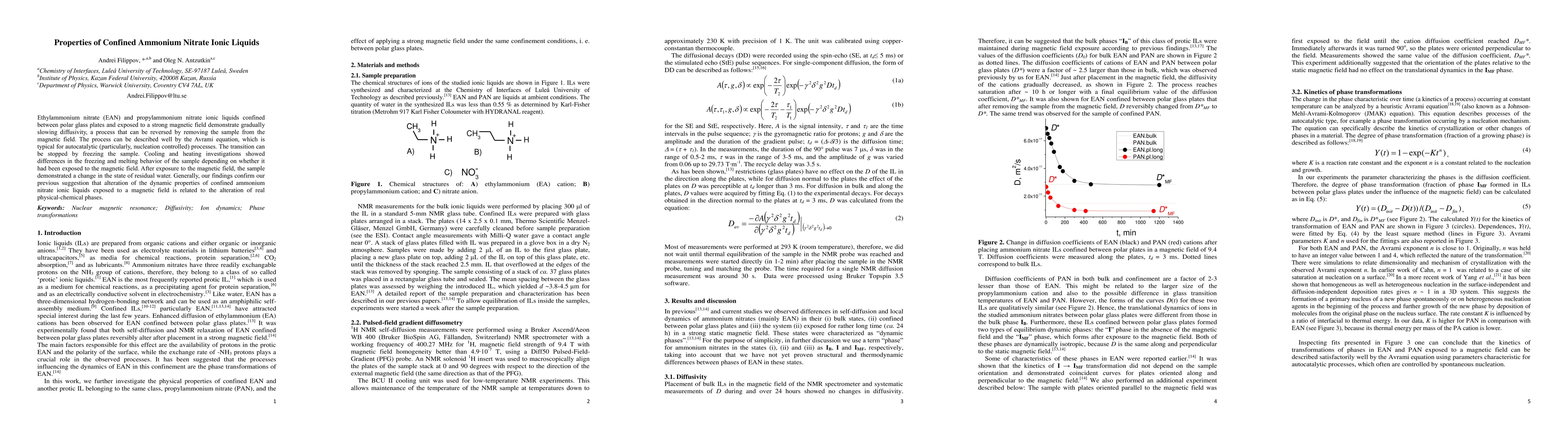 Ethylammonium nitrate (EAN) and propylammonium nitrate ionic liquids confined between polar glass plates and exposed to a strong magnetic field demonstrate gradually slowing diffusivity, a process that can be reversed by removing the sample from the magnetic field. The process can be described well by the Avrami equation, which is typical for autocatalytic (particularly, nucleation controlled) processes. The transition can be stopped by freezing the sample. Cooling and heating investigations showed differences in the freezing and melting behavior of the sample depending on whether it had been exposed to the magnetic field. After exposure to the magnetic field, the sample demonstrated a change in the state of residual water. Generally, our findings confirm our previous suggestion that alteration of the dynamic properties of confined ammonium nitrate ionic liquids exposed to a magnetic field is related to the alteration of real physical-chemical phases.